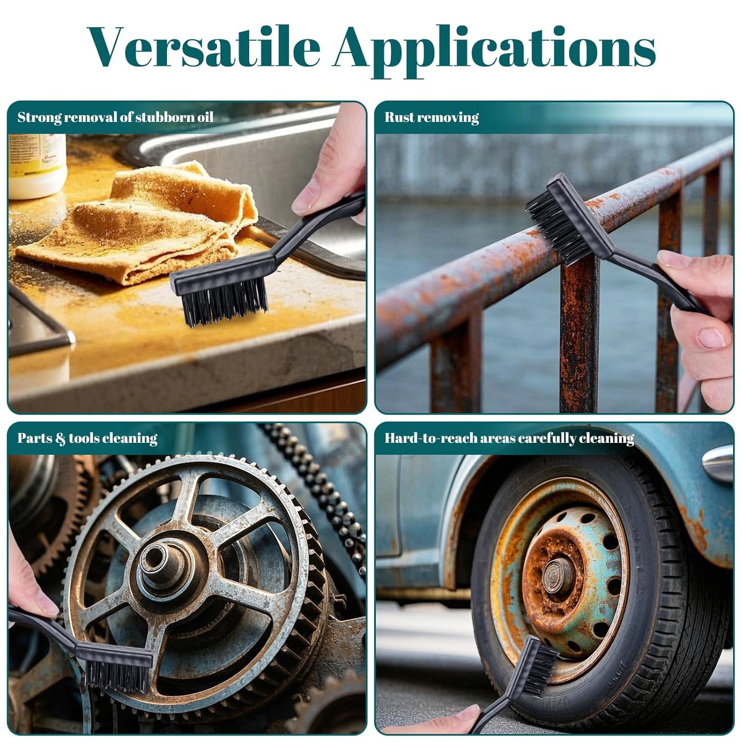 - 【Wide range of applications】: The nylon brush set is suitable for cleaning and descaling in different industries, such as steel, machinery, metal parts, welding slag, cleaning kitchens, door frames, sliding doors, floor tiles gaps, without damaging the surface or fine features.