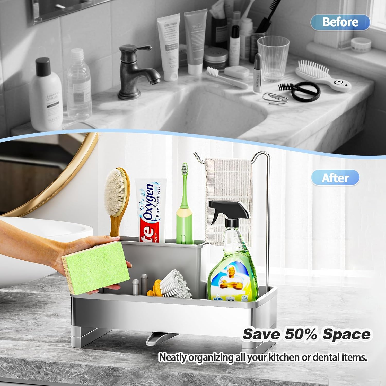 - 【Versatile Kitchen Sink Organizer】The sink caddy is not only suitable for kitchen sinks, but also for bathroom and vanity countertops, making it a great helper to keep things neat and organized. The kitchen sink organizer is easy to install and can be installed in less than five minutes. It is suitable as a gift for friends and family. If you have any questions, please contact customer service.