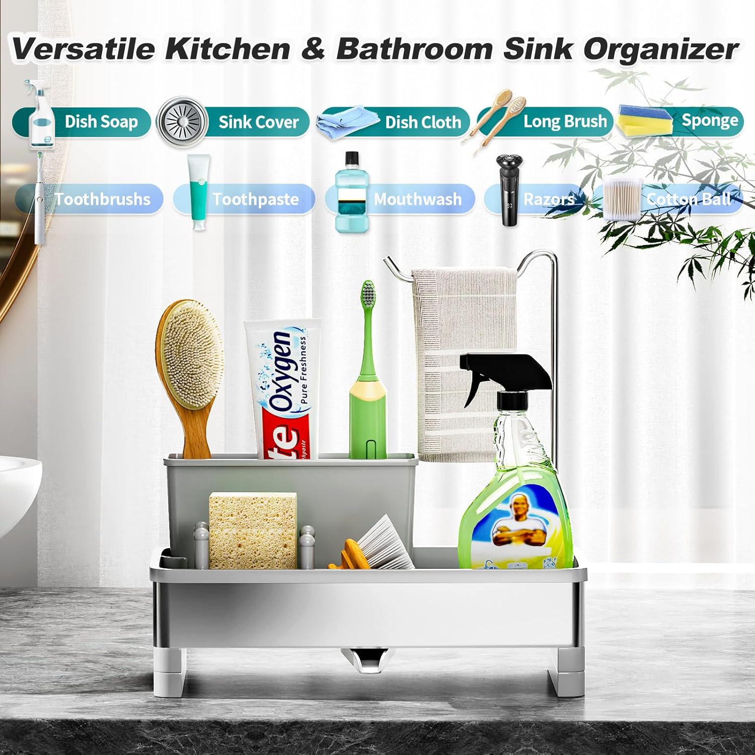 Stainless Steel Sink Caddy, Sponge Holder for Kitchen Sink with Brush Holder & Dishcloth Rack, Rustproof Sink Organizer Countertop, Kitchen Organizers Storage Essentials (F-Gray)