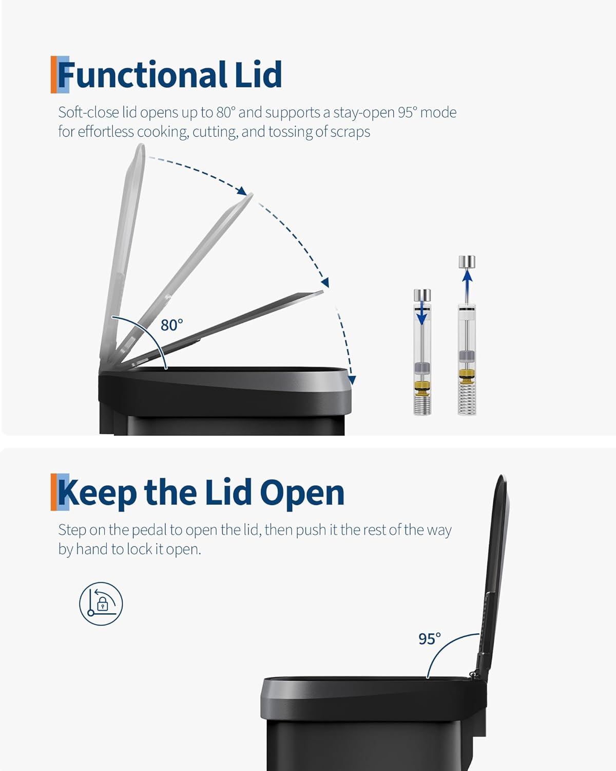- [PRACTICAL DESIGN] – The Garvee’s tall step-on kitchen trash can prioritizes ease of use with an ergonomic rear handle for effortless lifting and relocation. The soft-close lid opens smoothly to 80° without hitting island edges and locks at 95° for hands-free cooking prep and scrap disposal. The integrated liner rim secures any standard bag snugly to prevent slips, bunching, or overhang