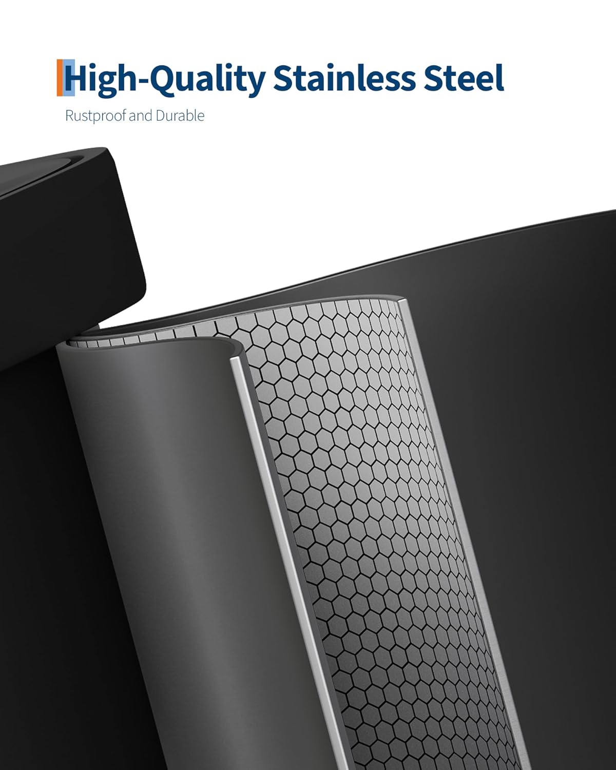 - [MINIMAL FORM, EXQUISITE DETAIL] – The Garvee powder coated metal garbage can for kitchen features a fingerprint-resistant finish that stays smudge-free and wipes clean with a soft cloth. An integrated liner rim hides bag edges for a seamless silhouette, while anti-slip rubber feet keep the bin stable on tile, hardwood, or low-pile carpet