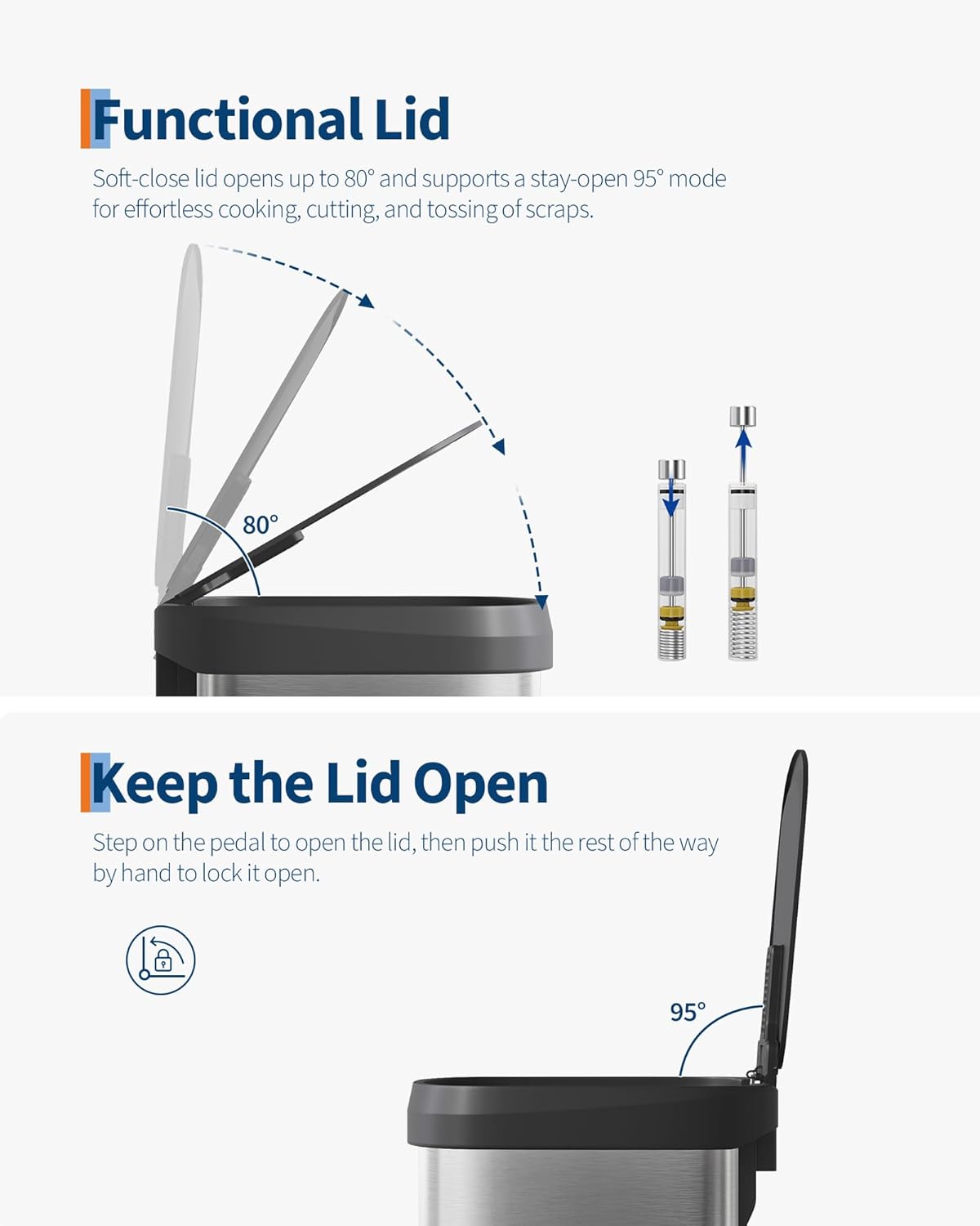 - [PRACTICAL DESIGN] – The Garvee’s tall step-on kitchen trash can prioritizes ease of use with an ergonomic rear handle for effortless lifting and relocation. The soft-close lid opens smoothly to 80° without hitting island edges and locks at 95° for hands-free cooking prep and scrap disposal. The integrated liner rim secures any standard bag snugly to prevent slips, bunching, or overhang