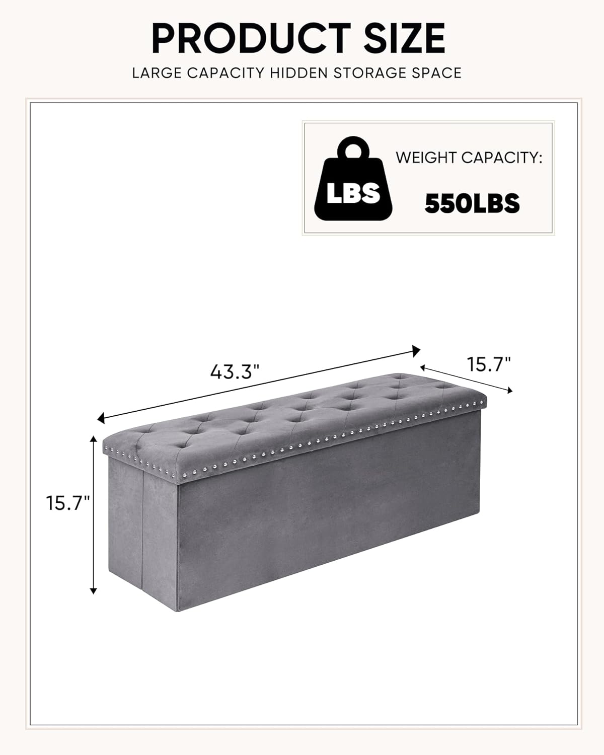 Velvet Storage Ottoman Bench, 43.3" Folding Ottoman with Rivet Trim, Heavy-Duty Upholstered Entryway Bench, Sturdy Footrest and Seat for Bedroom, Living Room, Holds up to 660 LBS, Grey