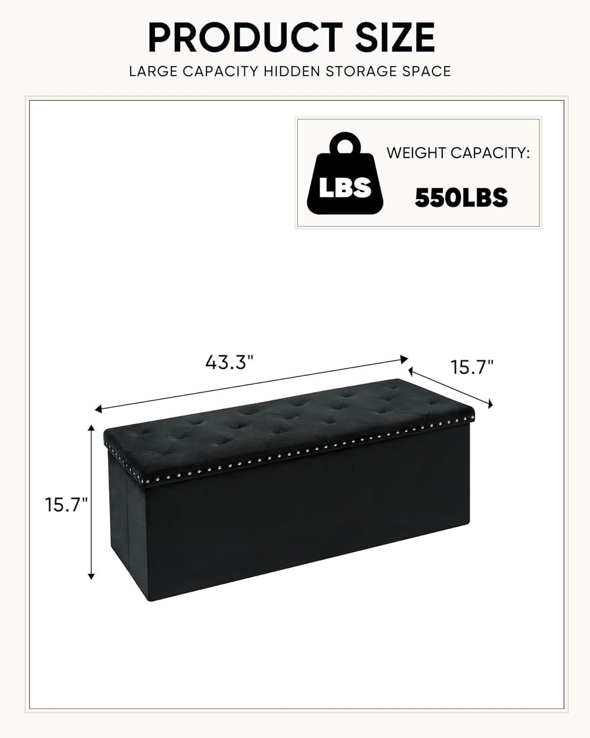 - Elegant Design with Rivet Detail: Our spacious storage ottoman bench is crafted from skin-friendly velvet fabric that feels soft to the touch. The extra rivet trim adds a touch of sophistication, making it a perfect accent piece for your home decor