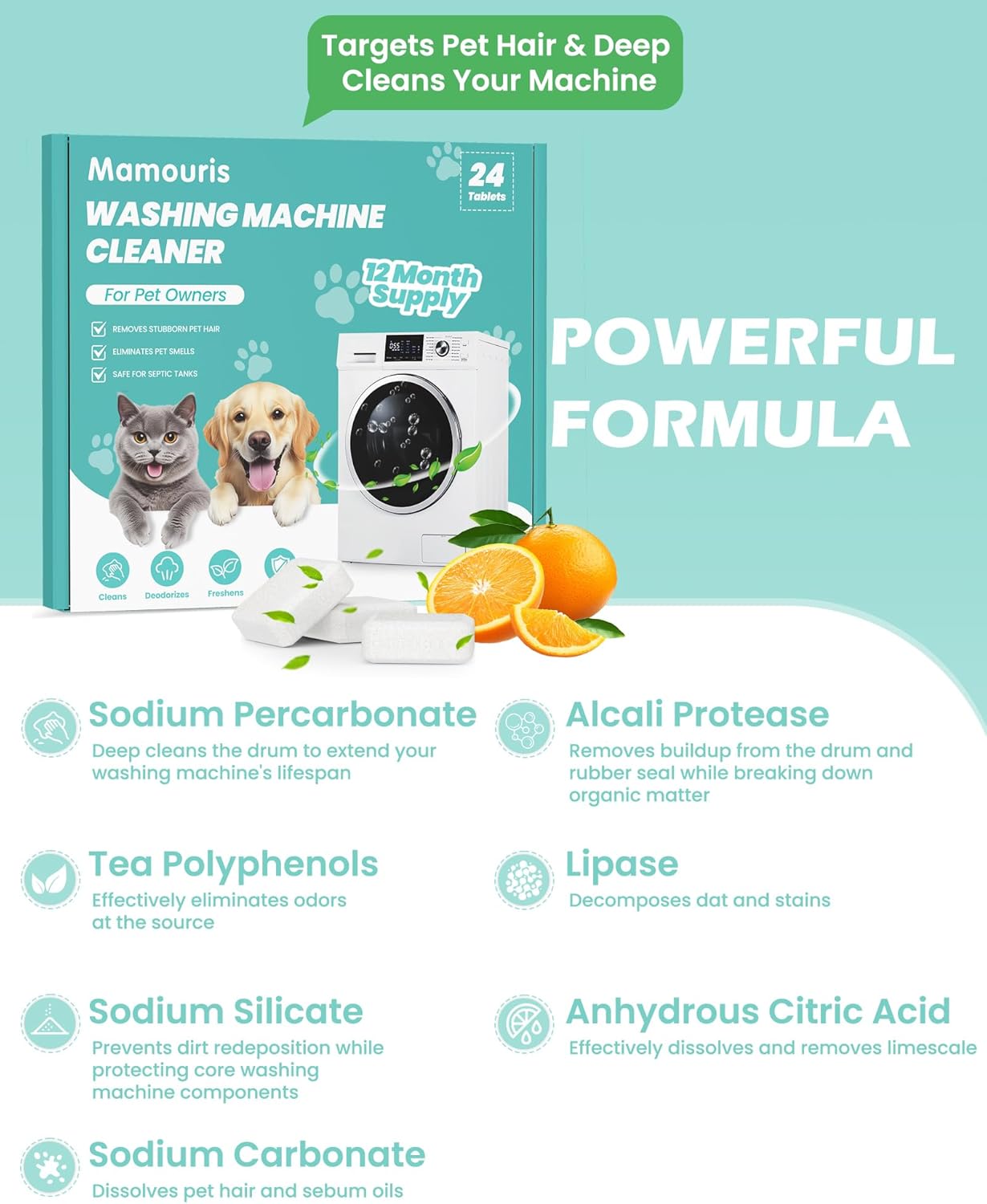 - Septic Safe: Mamouris pet hair remover contain tea polyphenols, lipase, sodium polyacrylate, sodium percarbonate, sodium carbonate and citric acid, specially formulated to remove odours, dirt, and other residue from washing machines. It breaks down naturally without harming septic systems. For peace of mind with every clean