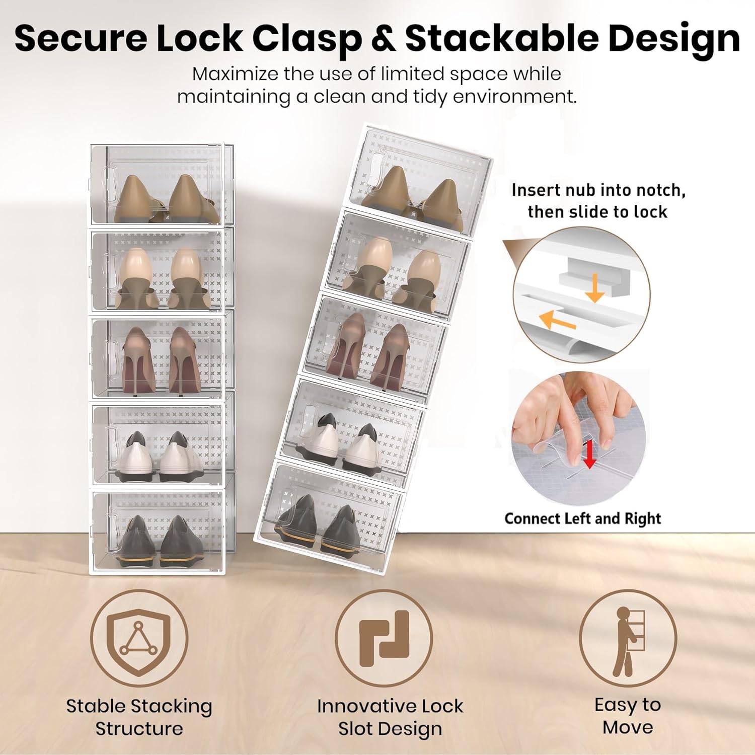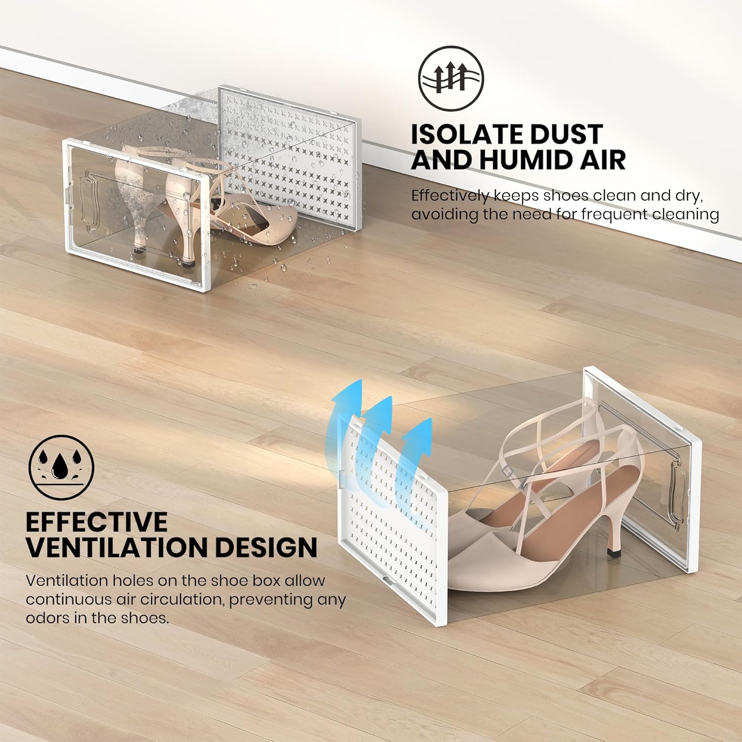 - Superior Shoe Organizer Solution: The lids of shoe boxes securely close to keep contents dust-free than traditional racks and provide better ventilation than closed shoe cabinets. Keeps your shoes fresh and dry while ensuring that they stay in great condition.