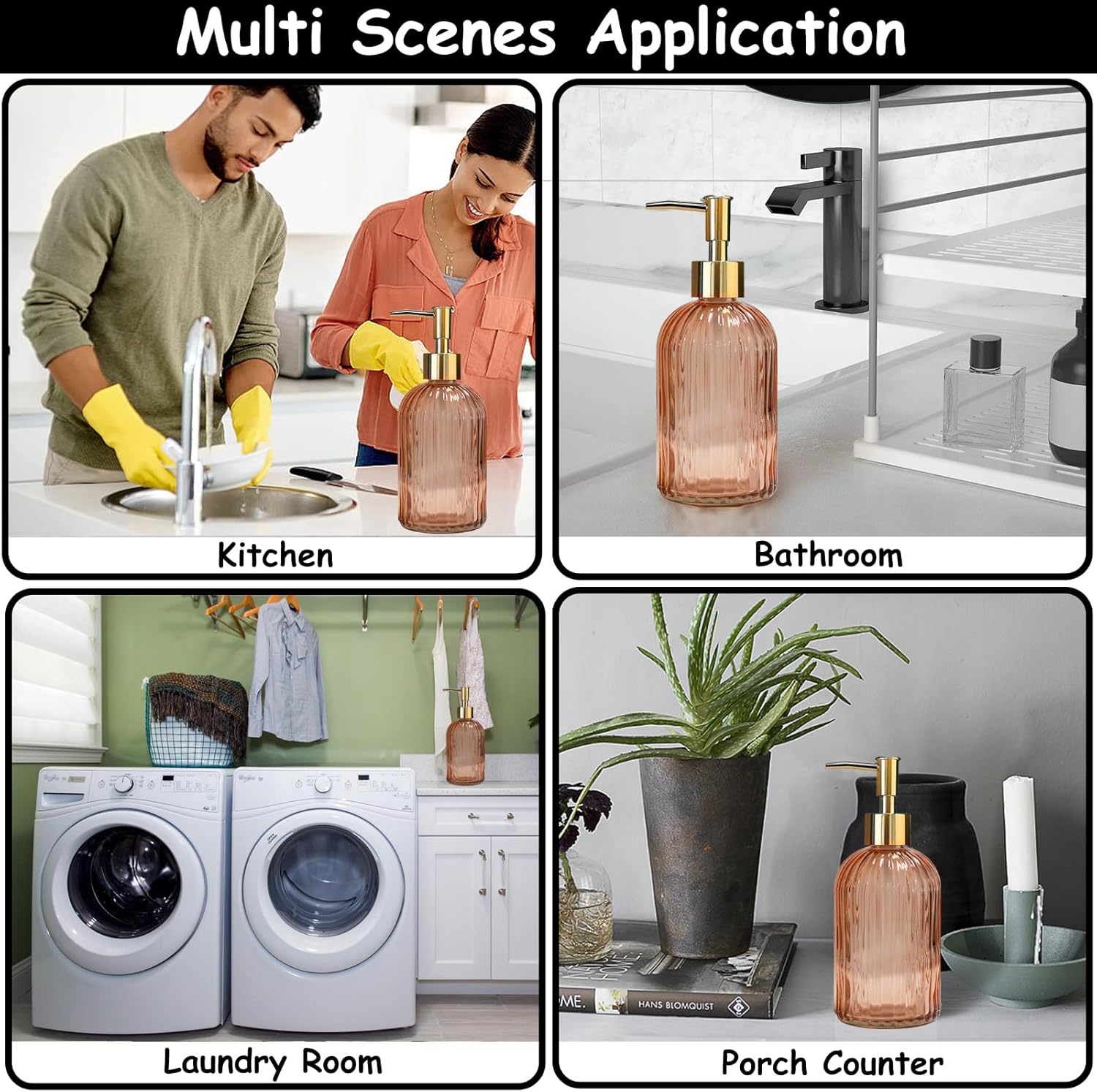 - 【Multi-purpose】Our refillable lotion soap dispenser uses in liquid soaps, detergents, lotions, essential oils, shampoos, shower gels, mouthwashes, massage oils, aromatherapy essential oil mixtures, food ingredients, etc. And it is suitable to be placed in bathroom countertop, kitchen sink, laundry room, farmhouse or outdoor such as beach.