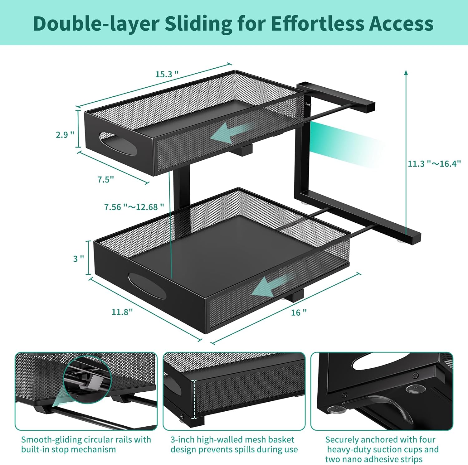 - 【5-Stage Height Adjustment】- Adjustable to five precise heights (11.3", 12.6", 13.9", 15.2", and 16.4") for versatile compatibility with various cabinet configurations. Easily customize it to perfectly accommodate your items. This multi-functional organizer is ideal as an under-sink organizer, kitchen countertop helper, bathroom storage solution, vanity organizer, and more!