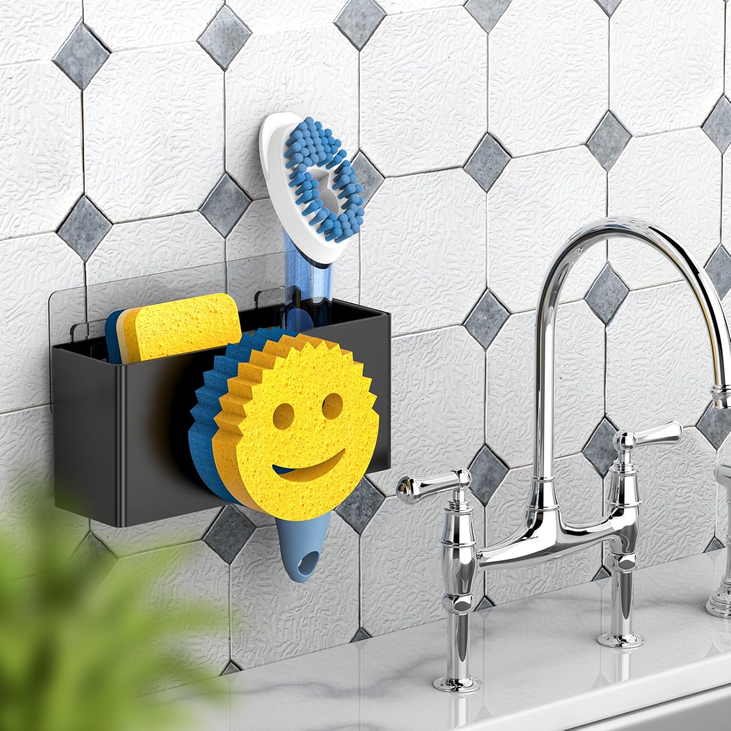 - DISTINCT APPEARANCE DESIGN: MURLONG have improved over the old version of this sink caddy feature.Not only can this sink sponge holder store a smiley face sponge,but it also holds a scrubber/dish brush/sink stopper