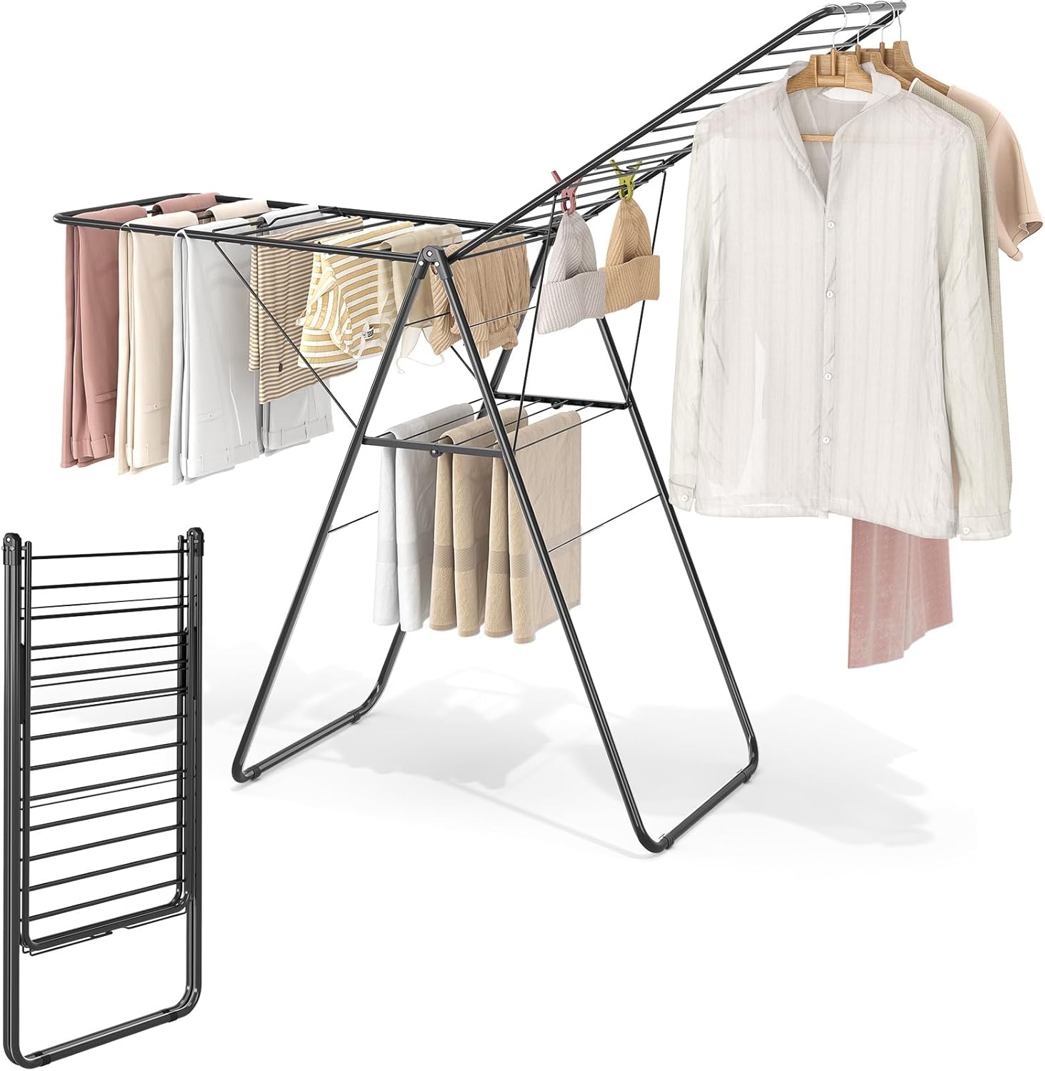 - Large drying space: 2-tier foldable rack. Top wings (70 inches) for quilts; 32 rods total, with the second tier for small items like socks/towels. Enough for the whole family.