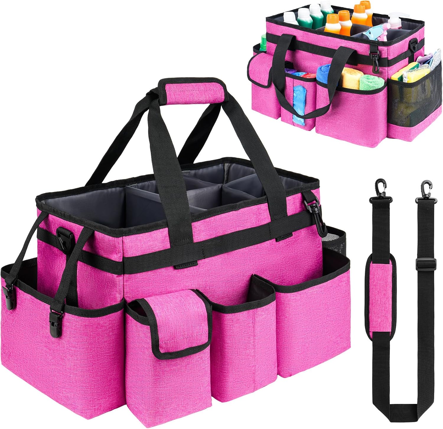 - Adjustable Shoulder Strap & Waist Strap: The cleaning caddy bag features an adjustable shoulder strap and waist strap, which can reduce stress for your shoulder and keep your body steady