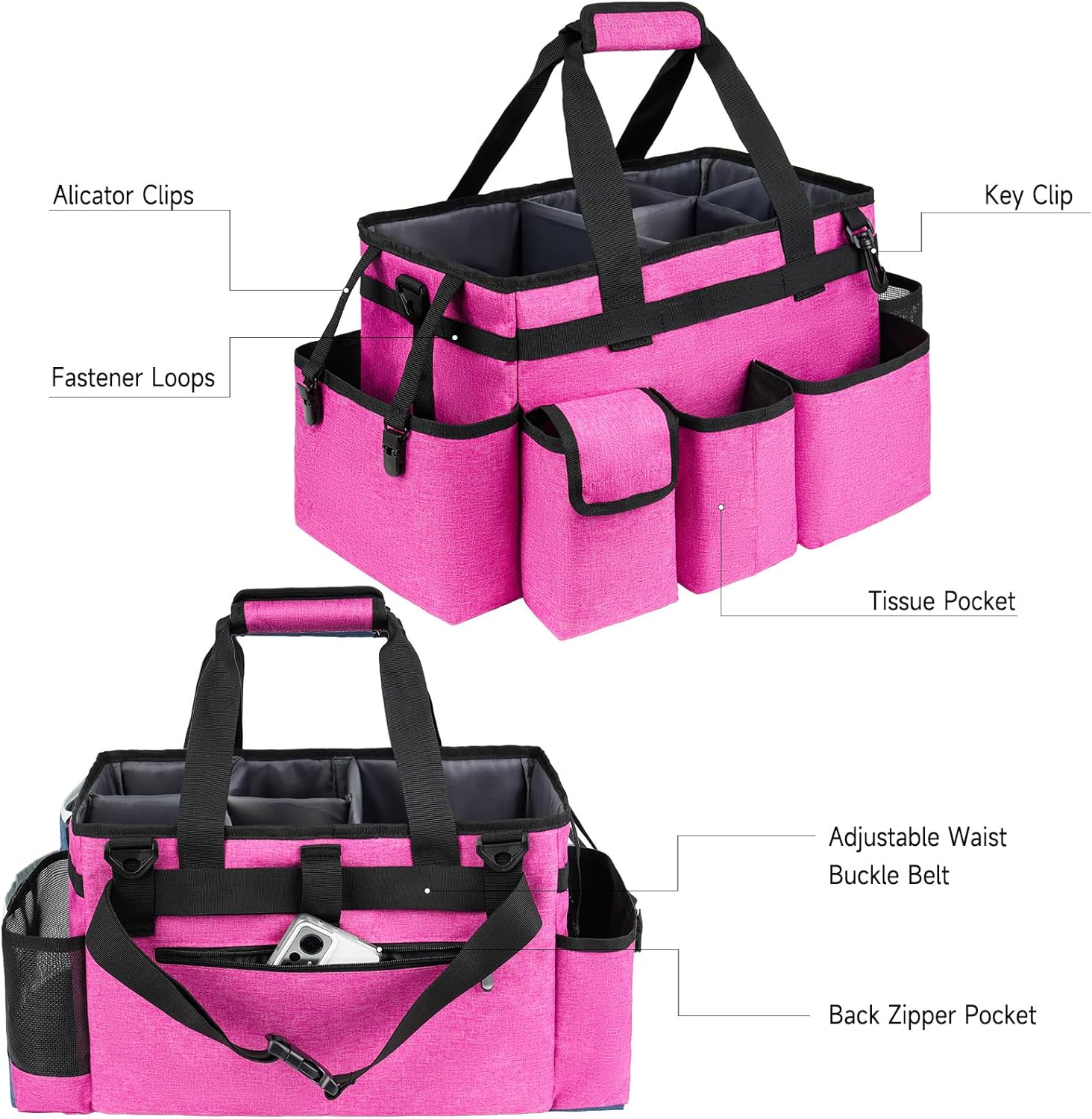 - Multi Pockets: Besides the large main compartment, this caddy bag has 6 pockets,the three front pockets can easily store some small item,large two sided pockets for storing large bottles, and back zipper pocket can store your valuable products