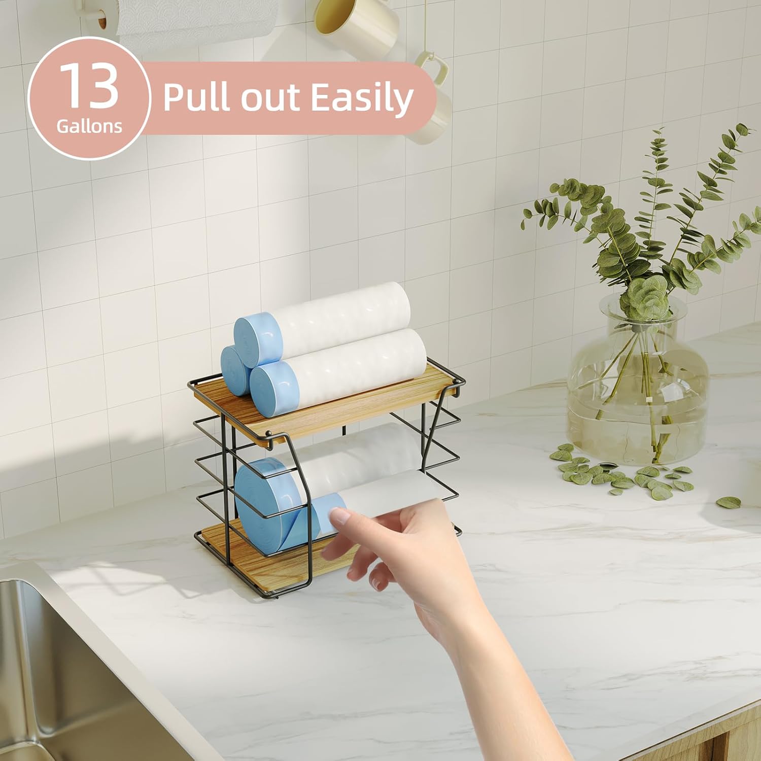 - 【Versatile for Multiple Scenarios】The garbage bag holder works seamlessly in under-sink setups (keeping trash bags within reach), pantry organizers and storage (tidying rolls), and laundry rooms. It’s also a handy kitchen organizer, simplifying home and kitchen tidying as a reliable trash bag dispenser