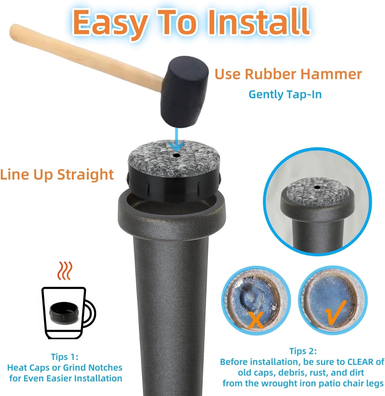 - Easy Installation, 16 Pack Value – Includes 16 patio chair feet caps for replacement glide caps of 4 chairs. Before installation, be sure to CLEAR of old caps, debris, rust, and dirt from the wrought iron patio chair legs, then tap the caps in with a rubber mallet. For even easier installation, heating the caps or grinding notches before fitting is recommended. These outdoor chair leg floor protectors provide lasting protection season after season.