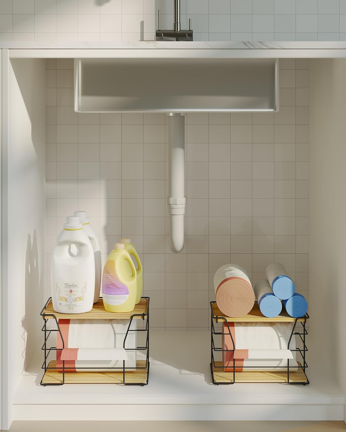 - 【Versatile for Multiple Scenarios】The garbage bag holder works seamlessly in under-sink setups (keeping trash bags within reach), pantry organizers and storage (tidying rolls), and laundry rooms. It’s also a handy kitchen organizer, simplifying home and kitchen tidying as a reliable trash bag dispenser