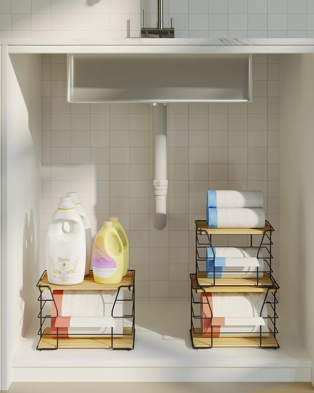 - 【Versatile for Multiple Scenarios】The garbage bag holder works seamlessly in under-sink setups (keeping trash bags within reach), pantry organizers and storage (tidying rolls), and laundry rooms. It’s also a handy kitchen organizer, simplifying home and kitchen tidying as a reliable trash bag dispenser
