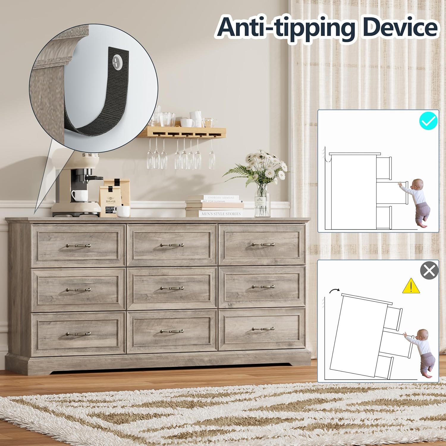 - Durable & Stable Construction: Crafted from high-density engineered wood, this sturdy dresser is built for long-lasting use. It features strong 3.5-inch legs and a 1.2" thick top that holds up to 180 lbs. Smooth metal drawer slides ensure easy operation of the deep drawers. For added peace of mind, an anti-tip device on the back panel keeps the dresser safe and reliable in any home, whether used as a closet dresser, hallway dresser, or living room dresser.