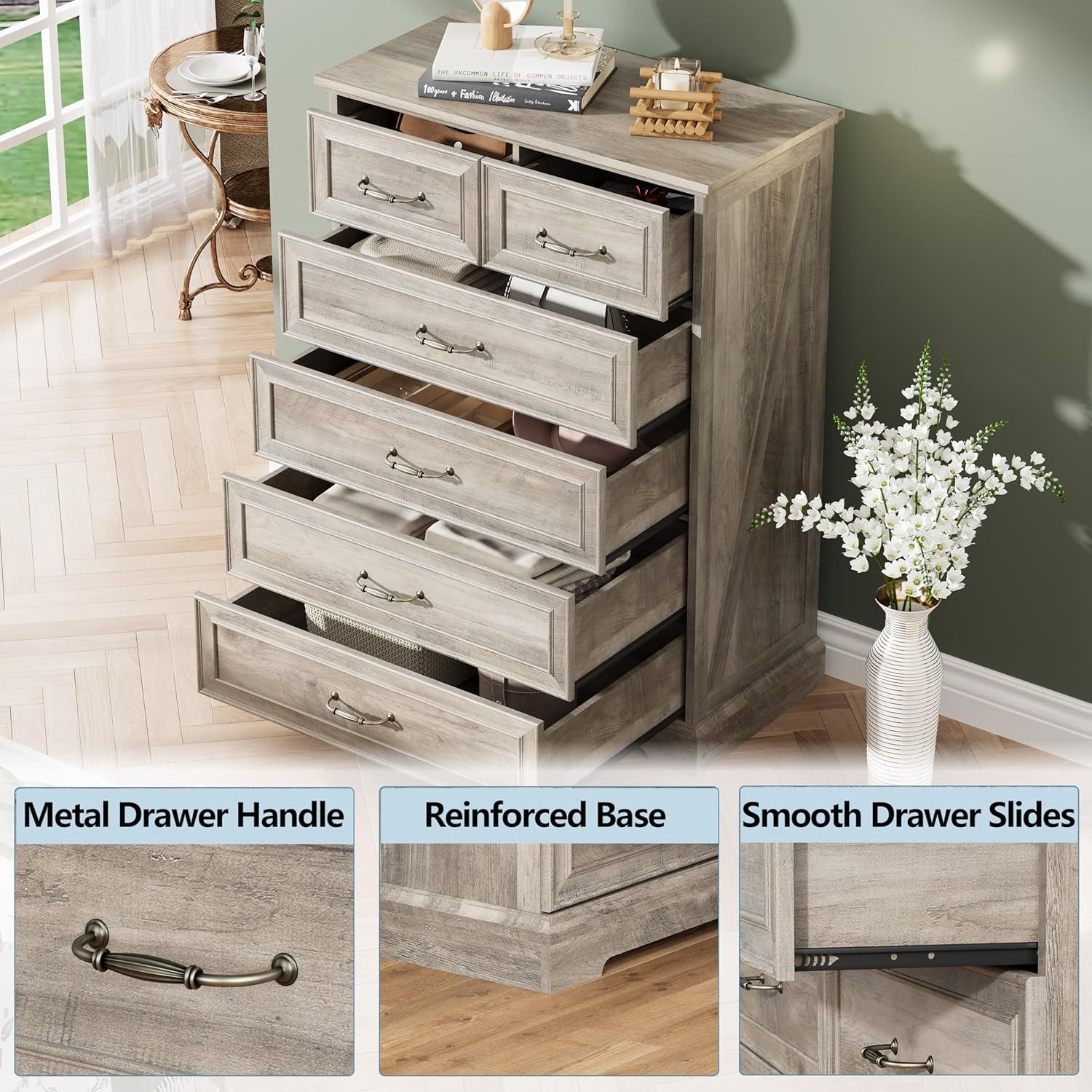 6 Drawer Dresser for Bedroom, 43" Tall Wooden Chest of Drawers, Rustic Farmhouse Dresser with Large Drawers & Metal Handles, Modern Storage Organizer for Closet, Living Room, Hallway, Grey