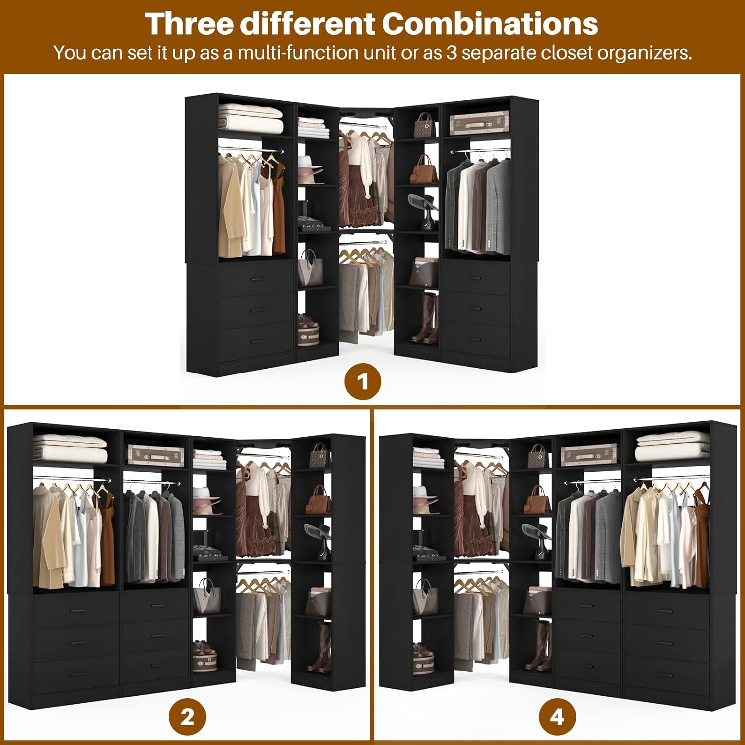 Corner Closet System with 6 Drawers, Closet Organizer System with 14 Shelves & 4 Hanging Rods, 87.2"L * 39.2"W / 63.2"L * 63.2"W Reversible L Shaped Walk-in Closets, Load 2500+LBS, Black