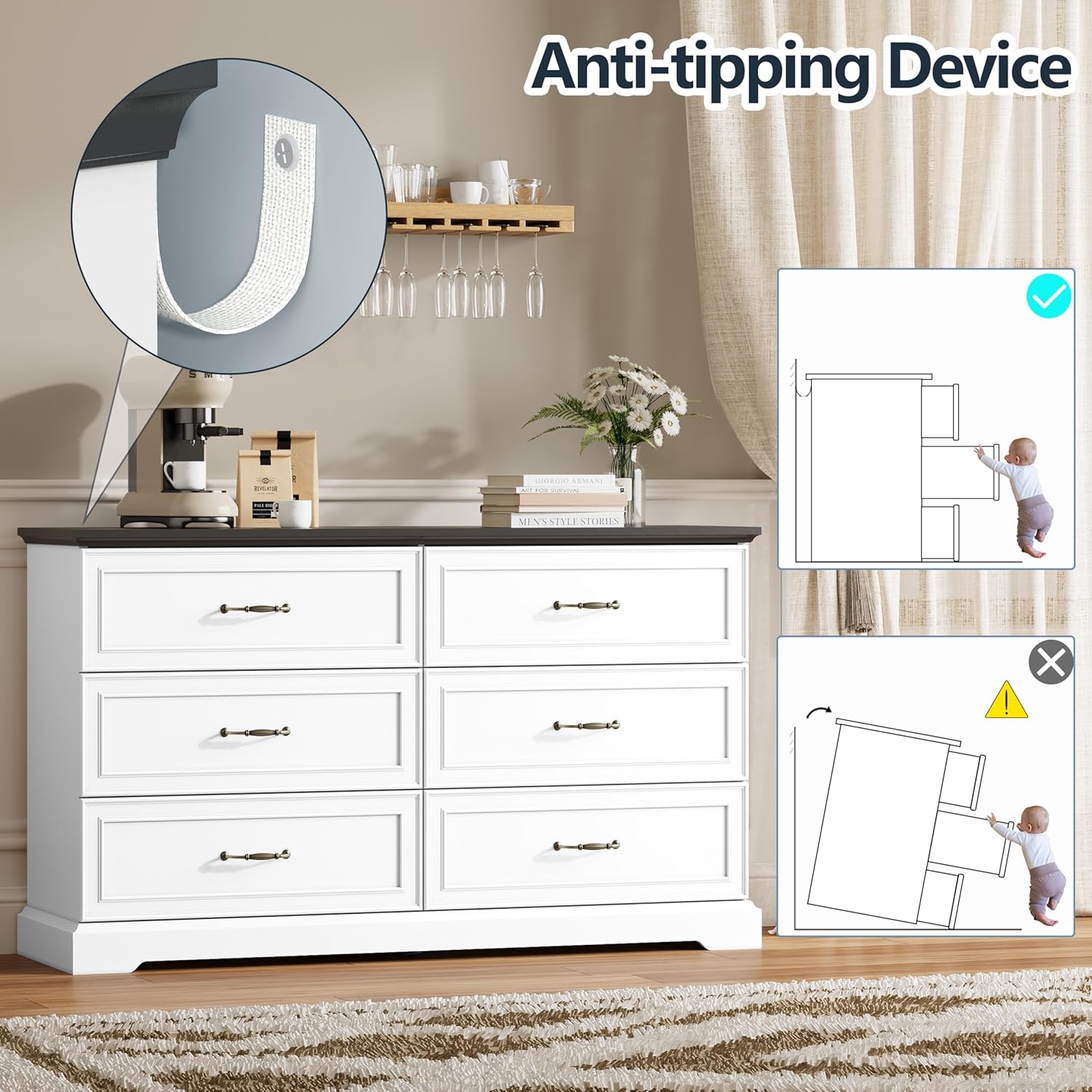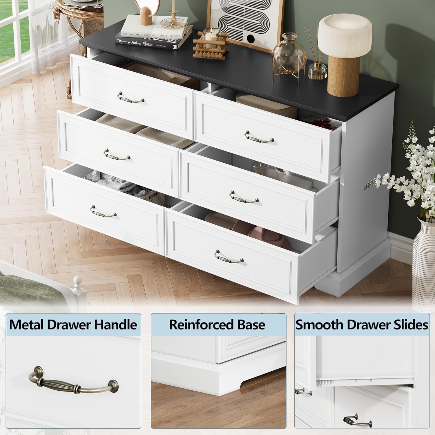 - Timeless, Refined Design: This 6-drawer farmhouse dresser for the bedroom combines sleek, contemporary lines with a pure white finish and a pure black top, bringing elegance and contrast to any room. The antique bronze metal handles add vintage charm, creating a perfect balance of traditional and modern design. Whether used as a modern dresser, a storage dresser, a bedroom dresser, or a tall dresser for closet, this piece serves as both a functional storage solution and a stylish focal point in your space.