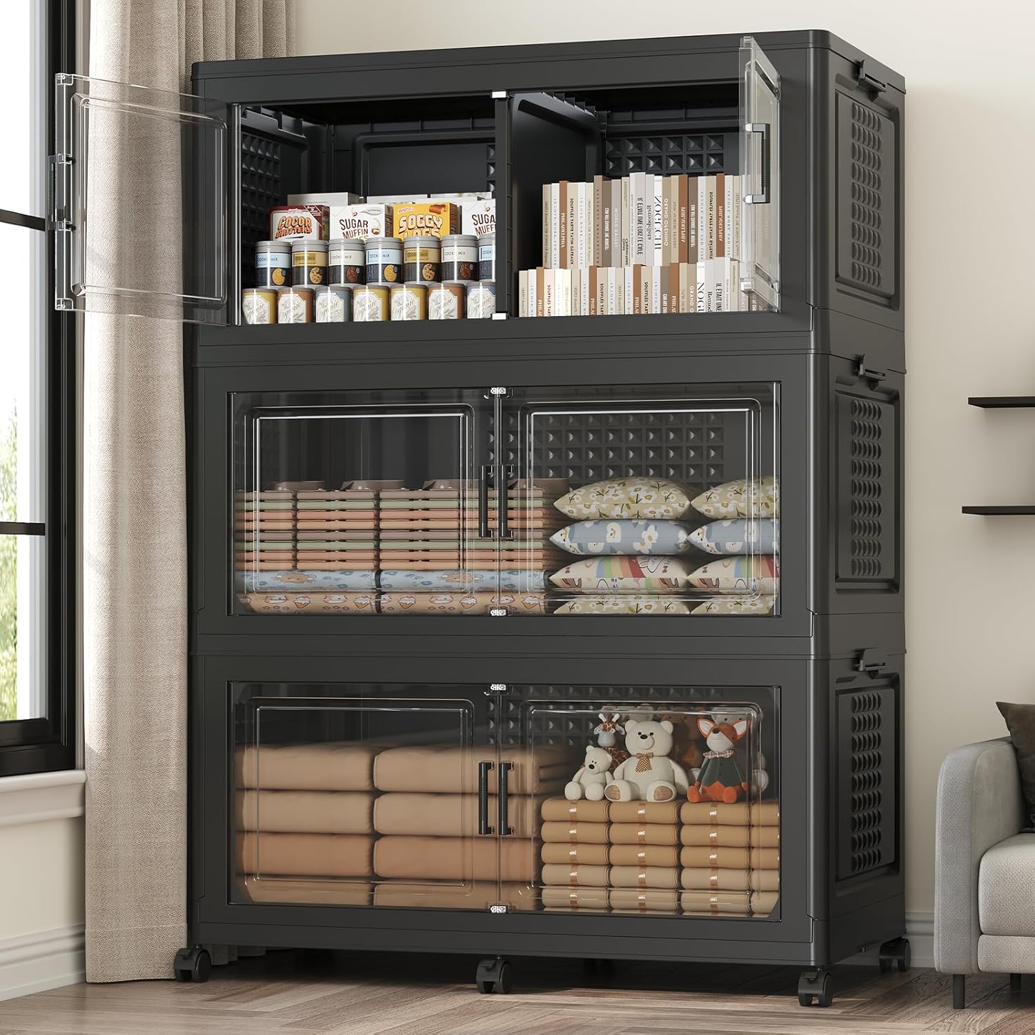 - 【Two Ways to Open & Clear Magnetic Door】The collapsible storage bins with lids and wheels feature a dual access way, allowing for both top and front door openings, and with clear windows for easy visibility. The stackable plastic storage bins with open front doors are equipped with magnetic lock buckles to prevent dust from entering the cabinet.