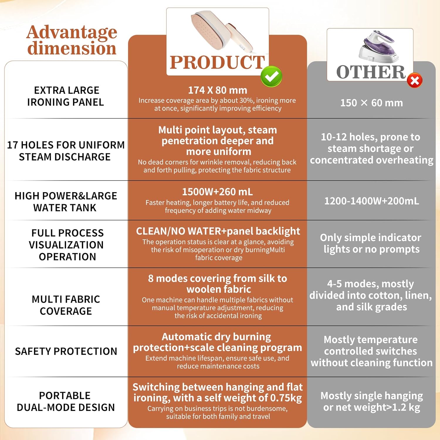 - 3. 🧳 0.75 kg Ultra-Light for Travelers & Airbnb Hosts:Weighs only 0.75 kg and stows easily in luggage or guest rooms. Flip between vertical steaming and flat-iron mode to serve business guests or vacationers.