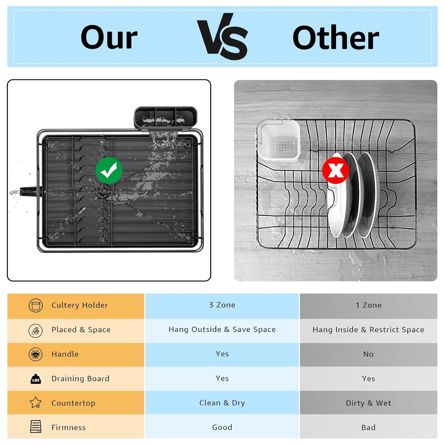 - 【Multifunctional Cutlery Holder Saves More Space】This dish drying rack for the kitchen counter features a hanging external cutlery holder, which frees up valuable space inside. The holder comes with a protruding drain outlet that guides water directly to the drainboard, ensuring efficient water management. Dish rack has 3 compartments to provide dedicated space for your forks, knives, and spoons, keeping your cutlery organized.