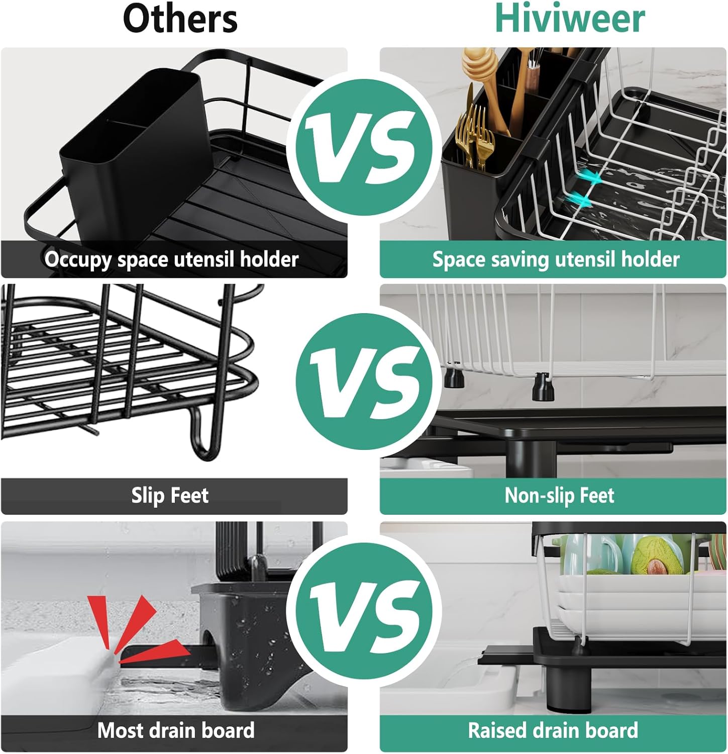 - 【EASY INSTALLATION】Hiviweer kitchen drying rack has a simple structure and is very easy to install as no tool is needed in the process,even the elderly/teenagers can do it easily.Compared to other similar products, this dish rack not only features 4 PP plastic anti slip feet, but also the drainboard feet with 4 silicone leg covers to prevent slipping and make the overall dish rack more stable.