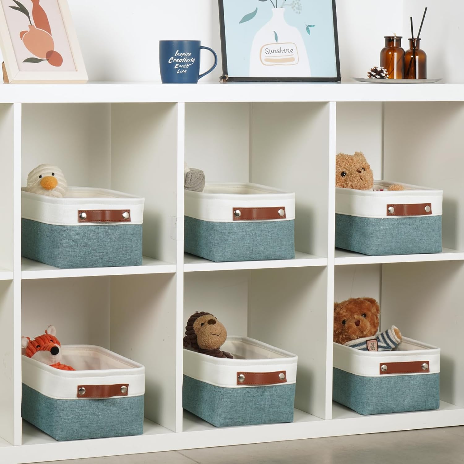 DULLEMELO Set of 6 Small Baskets for Organizing, Small Fabric Storage Bins for Storage, Collapsible Storage Bins with Handles for Shelves, Closets (11.8"x7.9"x5.1", White&Deep Green)