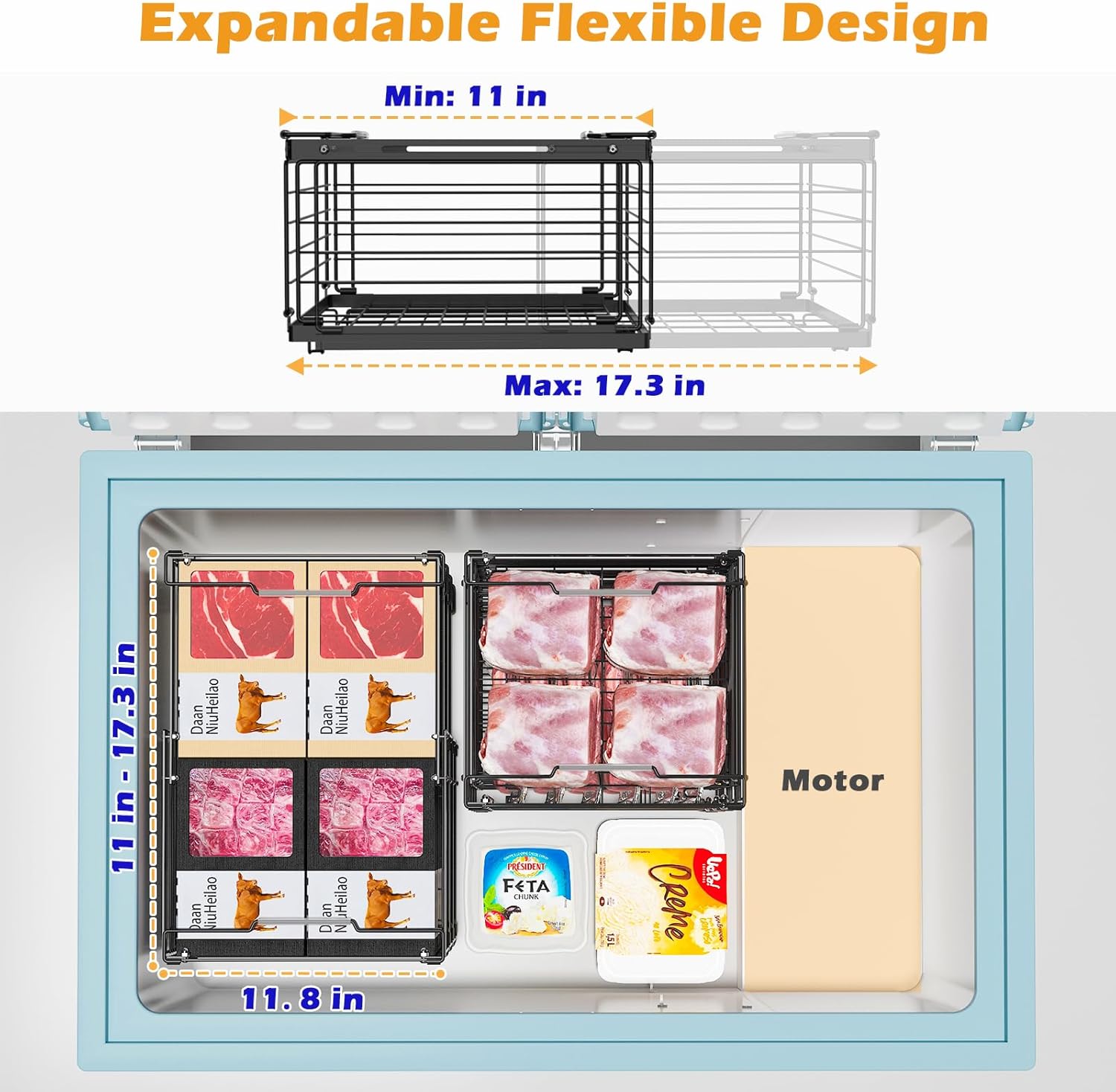 - 11" to 17.3" Adjustable Length for Perfect Fit in Any Freezer Compartment :The size of the large freezer bin is 11"-17.3"(L) × 11.8"(W) × 6"(H). The length of the expandable storage bin can be adjusted from 11 inches to 17.3 inches to seamlessly align with your chest freezer’s dimensions. No more wasted space!Please measure if it fits your freezer inside.