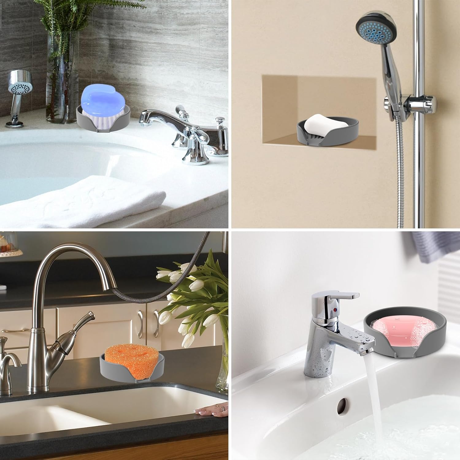 Self Draining Soap Dish, Silicone Suction Cup Soap Holder Tray Savers Container Sponge Holder for Bar Bathroom Shower Kitchen Sink, Can Extend Soap Life (1, Gray)