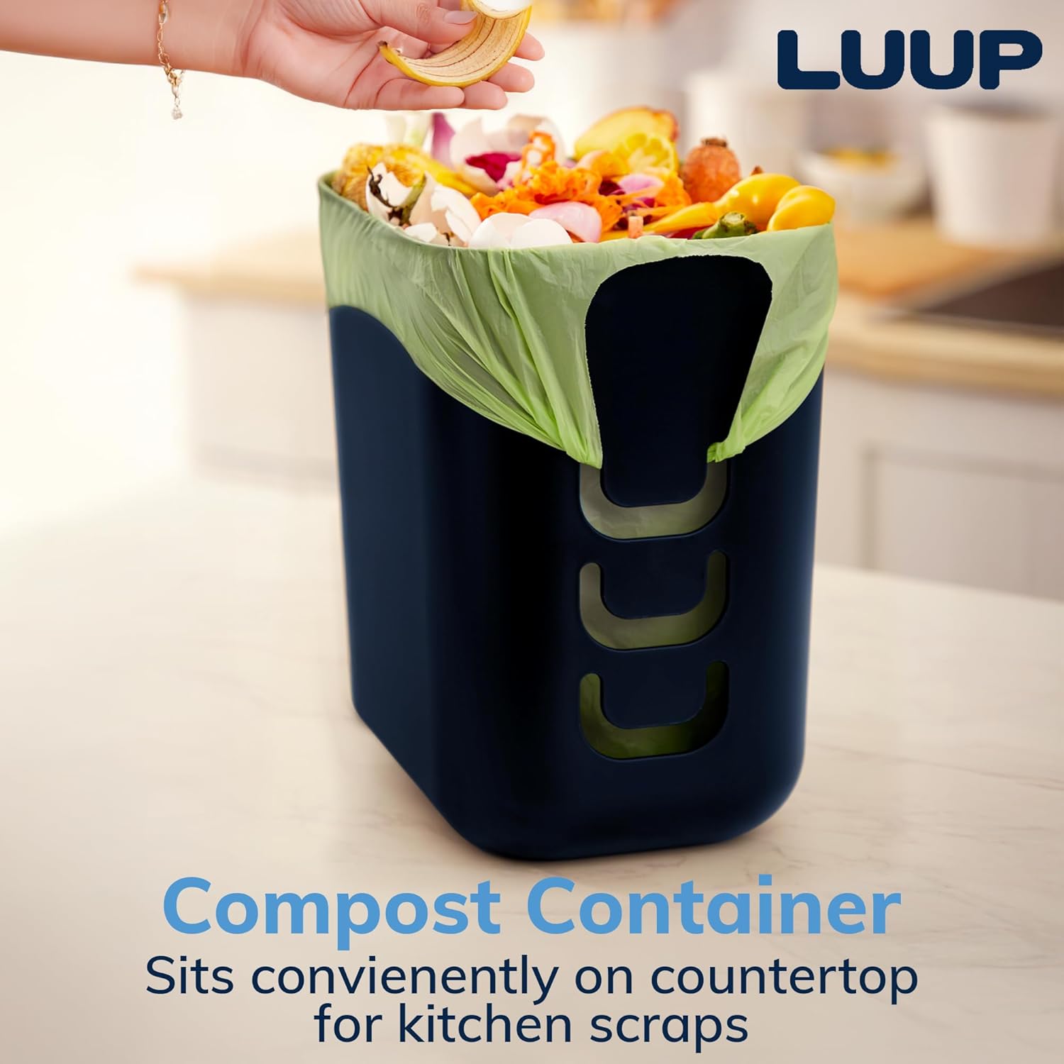 - Patented Smart Bag-Securing Tabs – Features three convenient tabs to hold grocery bag handles in place, preventing liners from slipping inside.