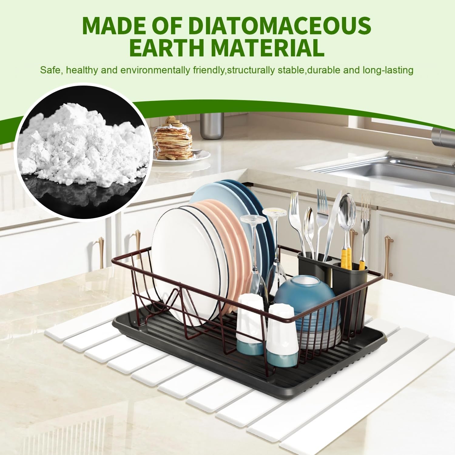 - Natural Diatomaceous Earth Material: Crafted from high-quality, food-grade diatomaceous earth, kitchen drying mat offers a sustainable and durable alternative to silicone or fabric dish pads for drying. It's safe and supports a healthy home environment