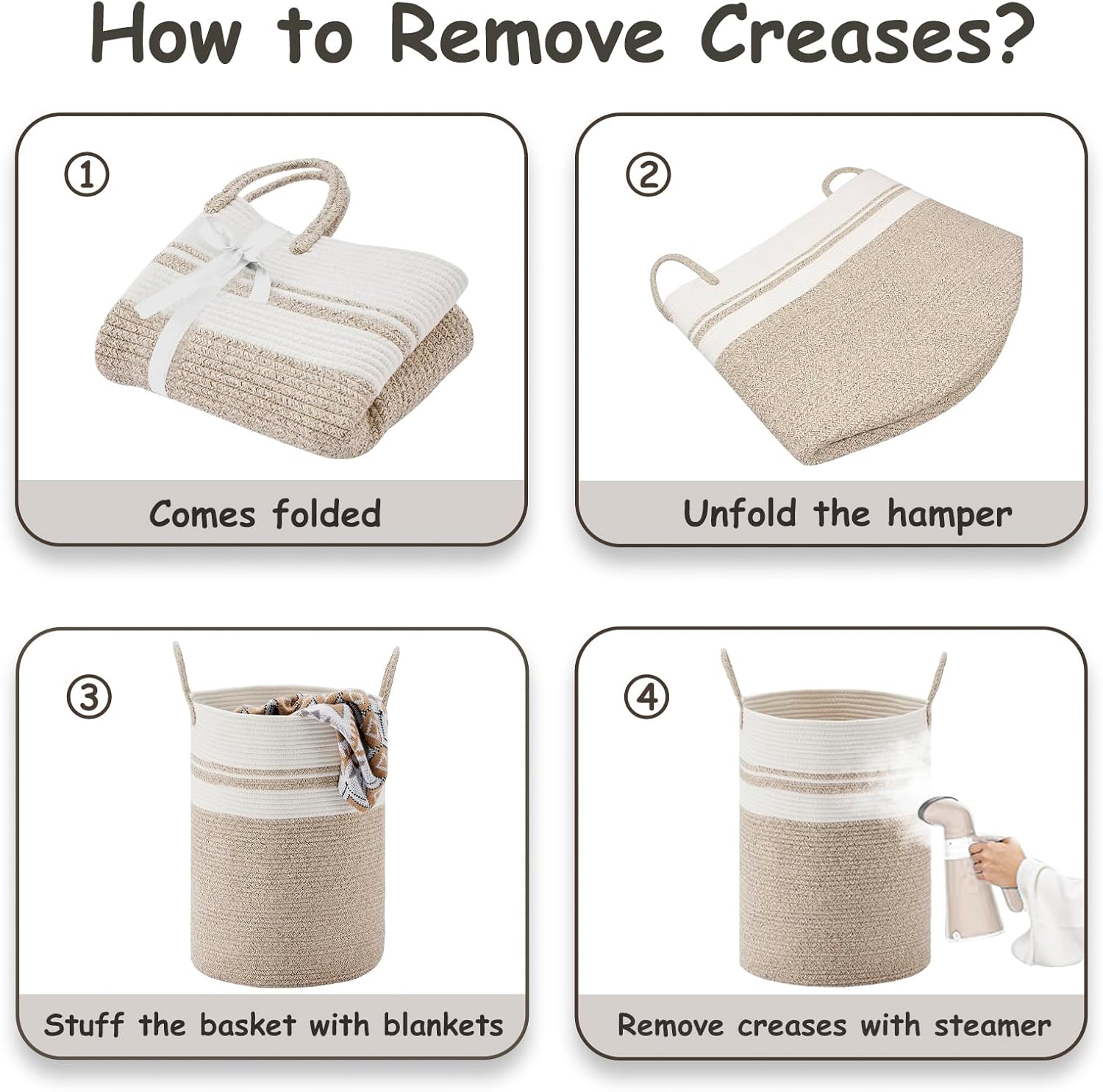 - ❤【Restore Elegant Shape】 To improve shipping efficiency, foldable woven rope hampers are packed compactly. You can put some blankets or small quilts in it and give it some time to regain its shape. Iron is a great idea to remove the creases.