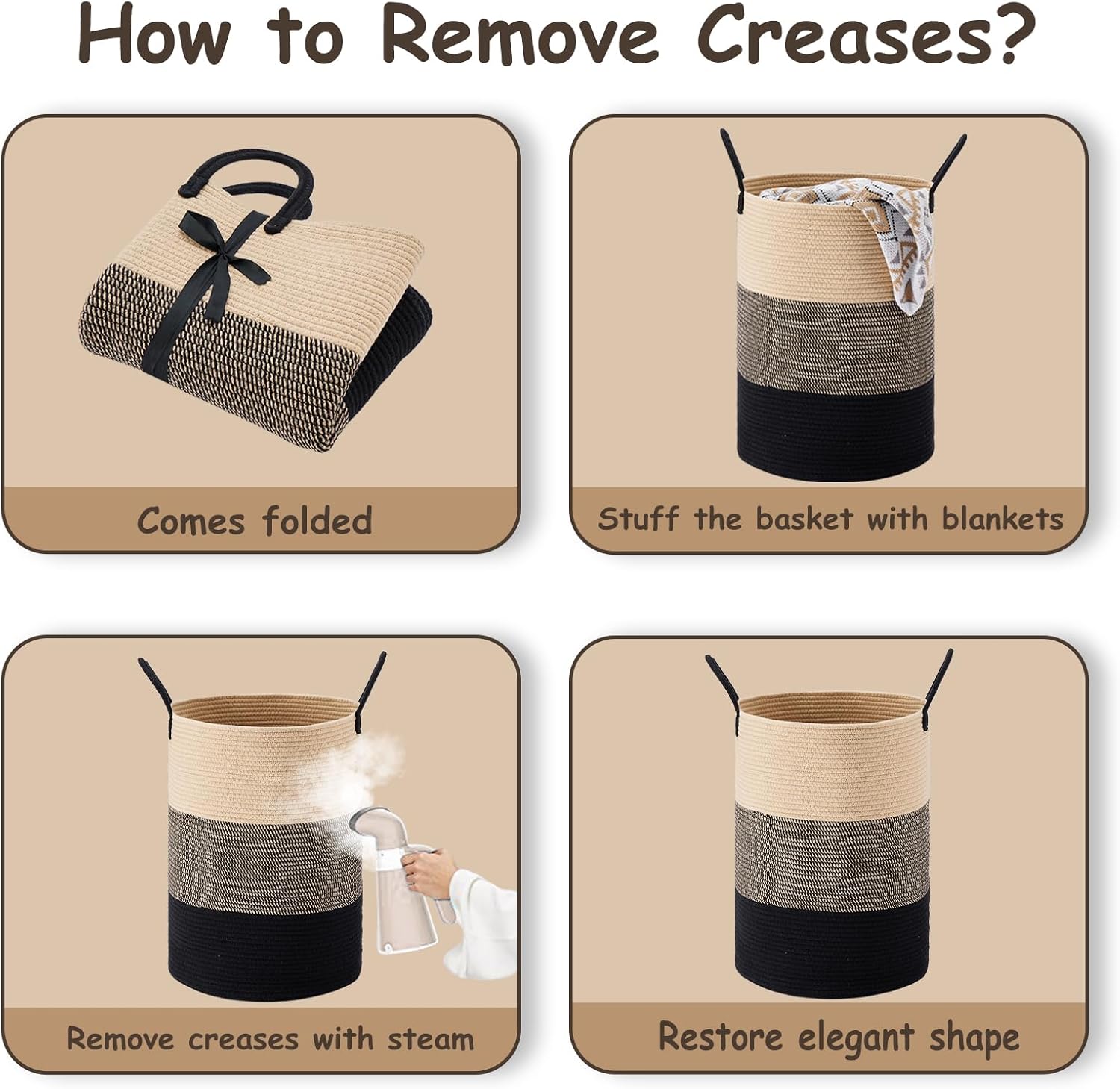 - ❤【Restore Elegant Shape】 To improve shipping efficiency, foldable woven rope hampers are packed compactly. You can put some blankets or small quilts in it and give it some time to regain its shape. Iron is a great idea to remove the creases.