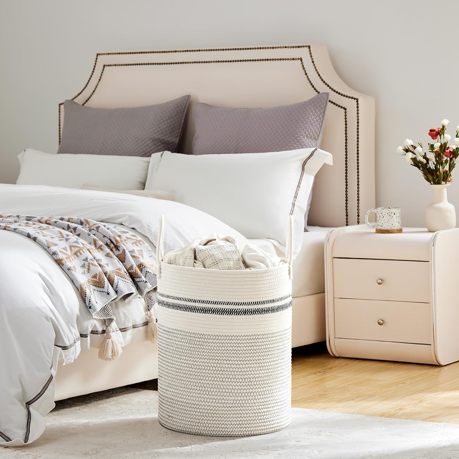 VIPOSCO Large Laundry Hamper, Tall Woven Rope Storage Basket for Blanket, Toys, Dirty Clothes in Living Room, Bathroom, Bedroom - 53L Stripe White