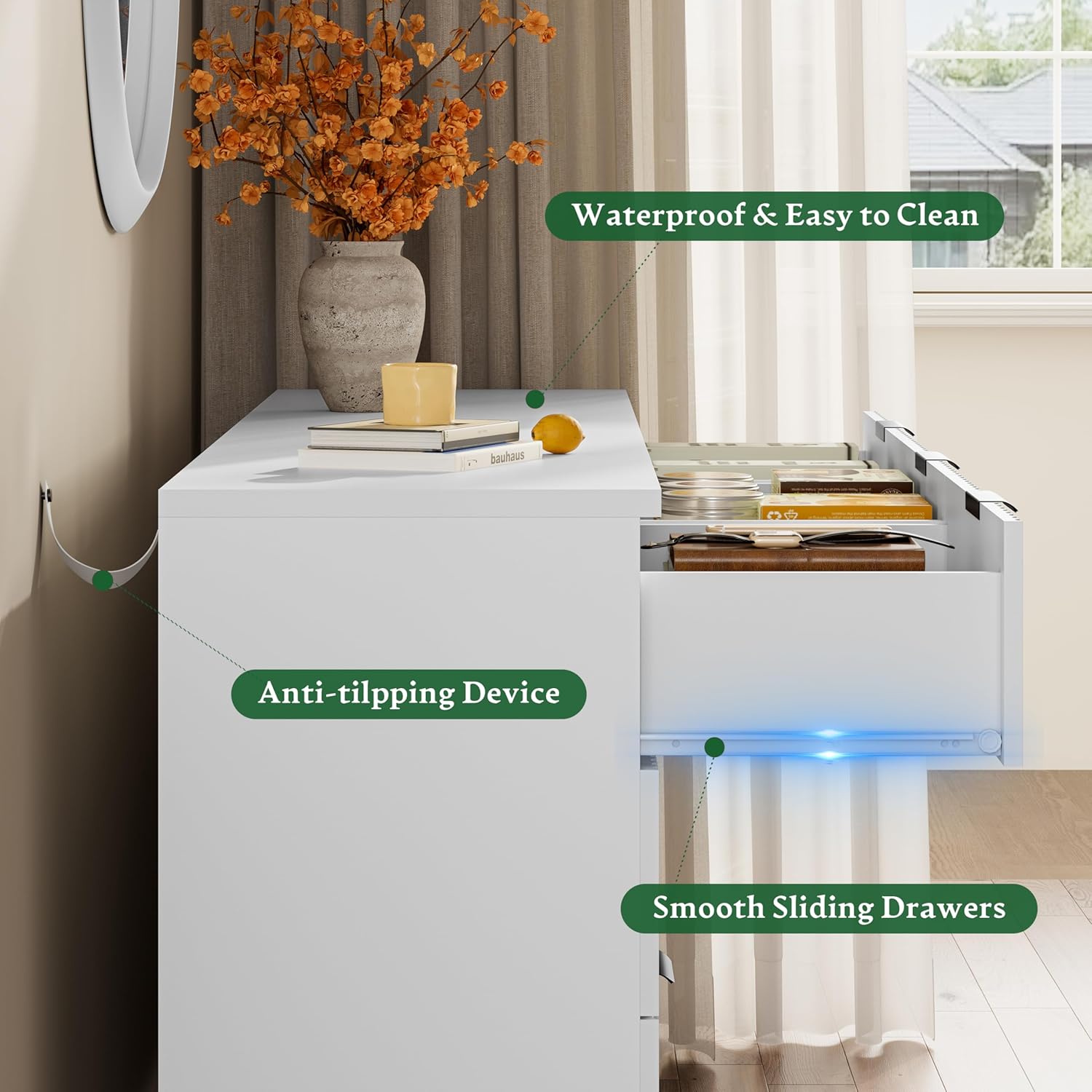 - 【Stability & Safety】The white/black/oak/grey dresser is equipped with an anti-tipping device, which can be fixed on the wall to prevent accidents. Each drawer contains a wide metal handle and built-in slide rail, easy to push and pull. Besides, the sturdy base provides this dresser with drawers a strong support and the middle feet can be adjustable to keep balance on uneven floors