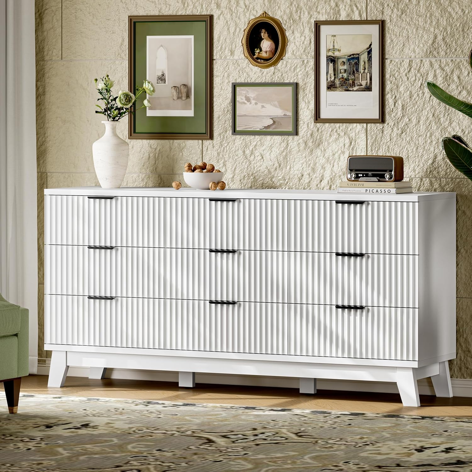 - 【Modern Chic Appearance】The unique wave-like fluted panel enhances the texture and elegance of this bedroom dresser. The thick table top features natural wood grain that complements the solid white finish. The wide metal handle and splayed base legs add a modern touch, creating a personalized and distinctive appearance