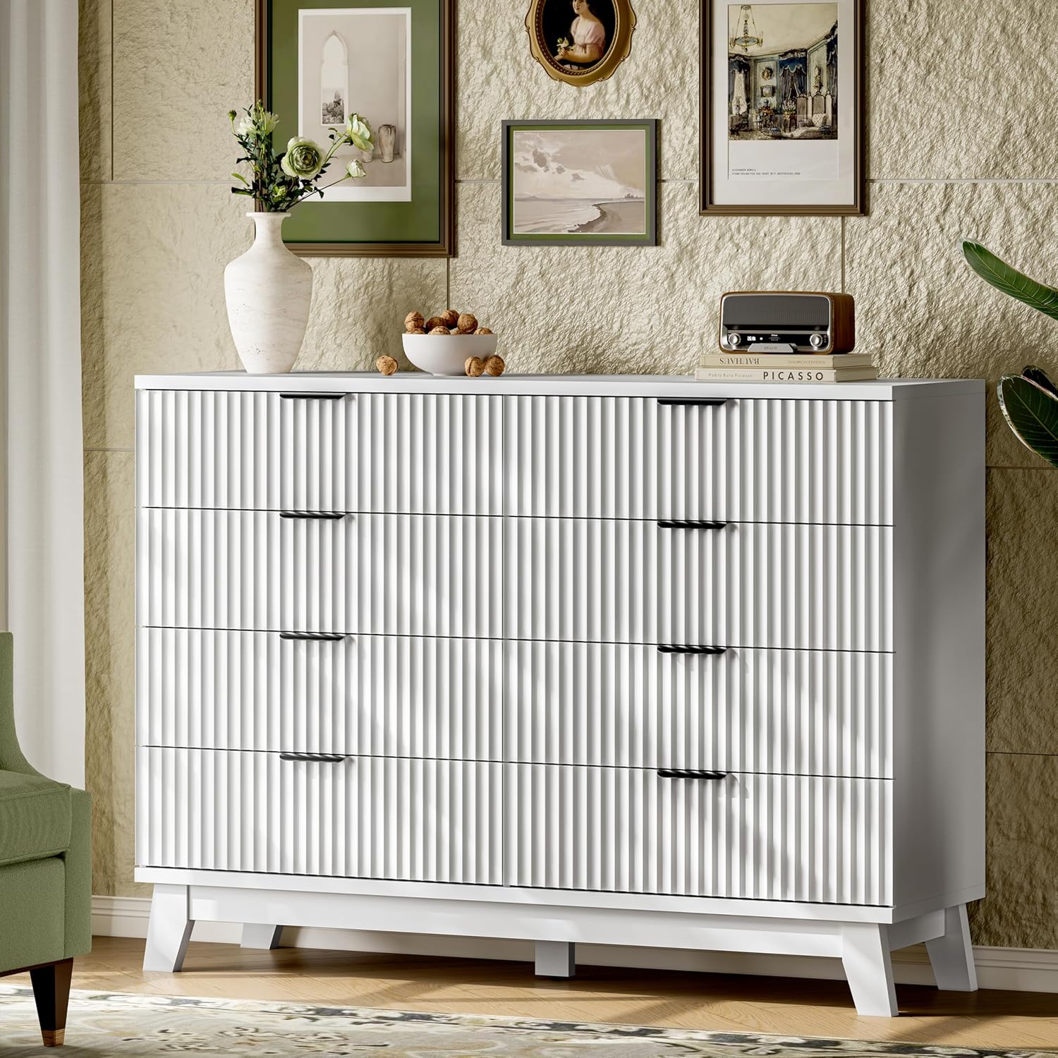 Fluted Dresser with 8 Drawers, 54" Wide Modern Chest of Drawers with Metal Handle, Wooden Dresser TV Stand, Wood Closet Clothes Storage Organizer for Bedroom, Living Room, Hallway, Solid White