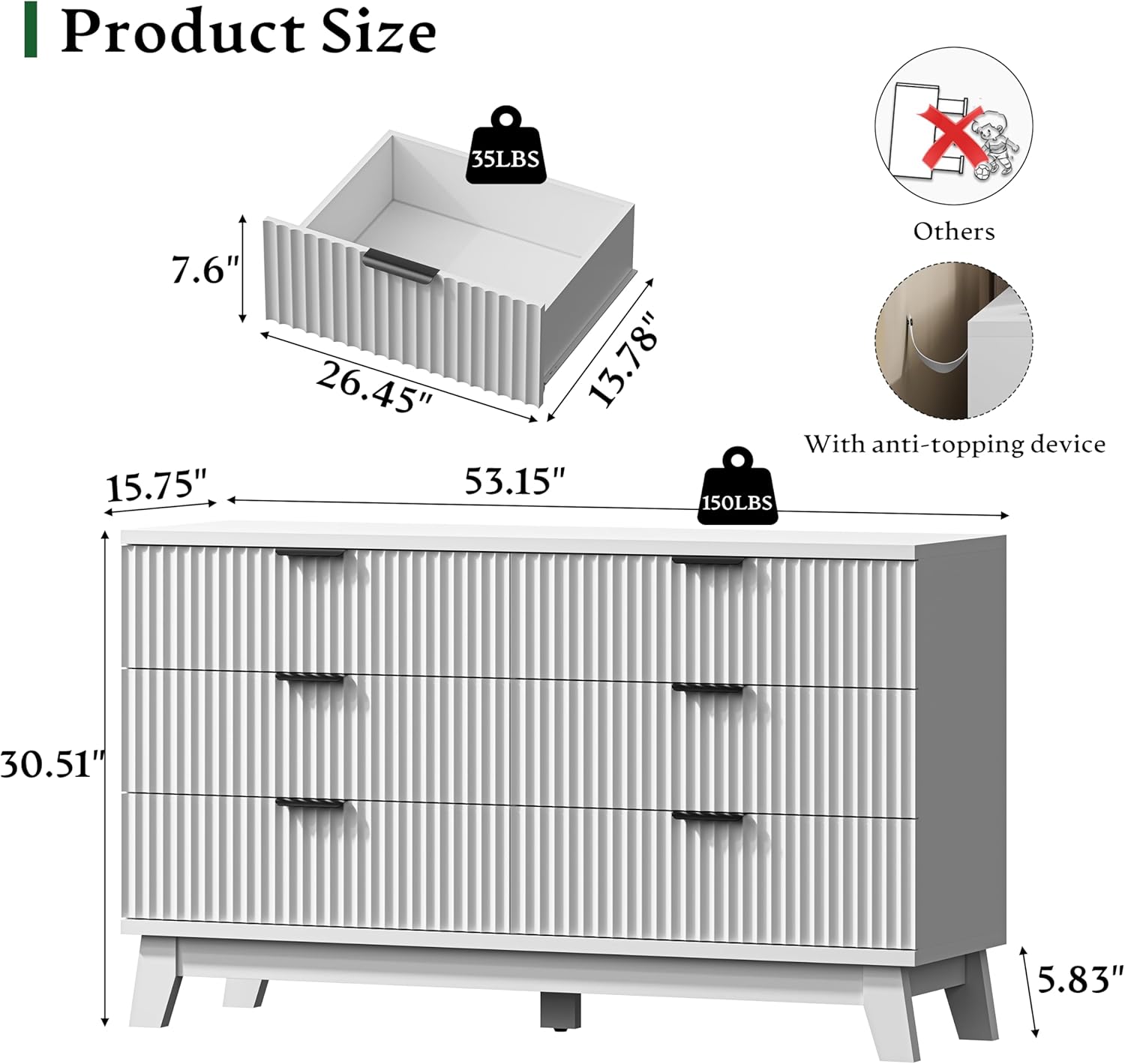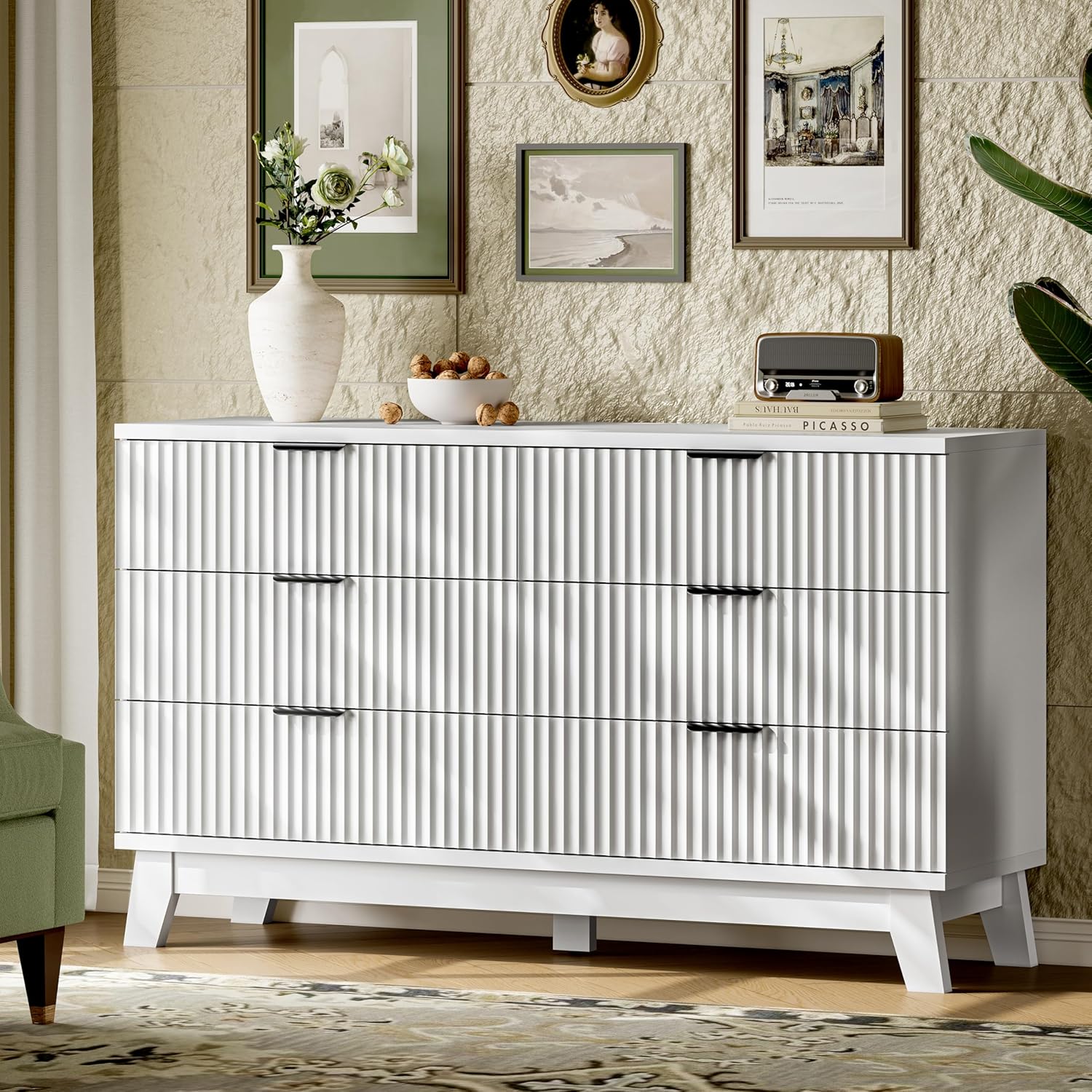 Fluted Dresser with 6 Drawers, 54" Wide Modern Chest of Drawers with Metal Handle, Wooden Dresser TV Stand, Wood Closet Clothes Storage Organizer for Bedroom, Living Room, Hallway, Solid White