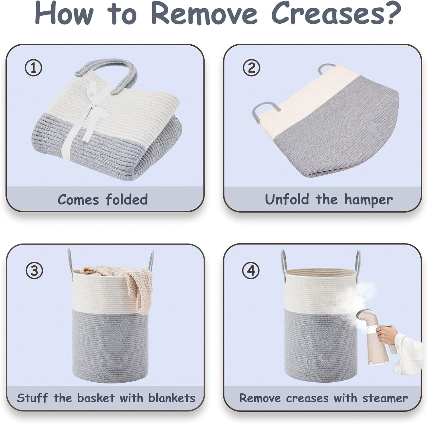 - ❤【Restore Elegant Shape】 To improve shipping efficiency, foldable woven rope hampers are packed compactly. You can put some blankets or small quilts in it and give it some time to regain its shape. Iron is a great idea to remove the creases.