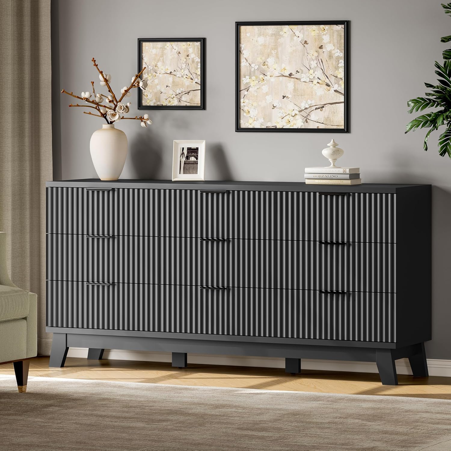 - 【Modern Chic Appearance】The unique wave-like fluted panel enhances the texture and elegance of this bedroom dresser. The thick table top features natural wood grain that complements the solid black finish. The wide metal handle and splayed base legs add a modern touch, creating a personalized and distinctive appearance