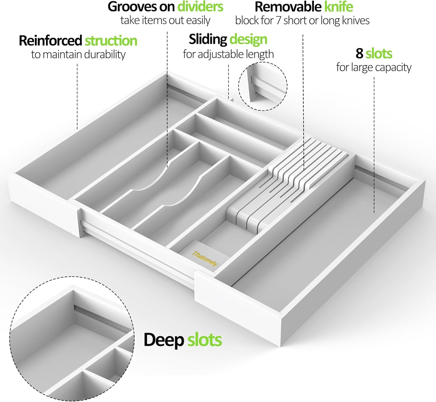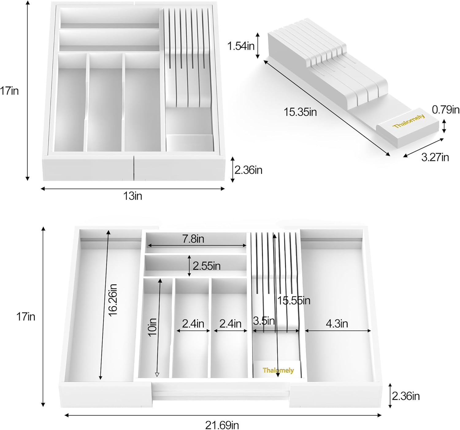 - Keep Your Kitchen Drawers Organized: When fully extended, it fits drawers up to 21.69 x 17 x 2.36 inches, and when fully collapsed, it fits drawers up to 13 x 17 x 2.36 inches. Featuring up to 8 compartments and a removable knife block, this organizer keeps your drawers tidy and practical, making it easy to find knives, forks, spoons, and other kitchen tools instantly. Say goodbye to messy jumbles and instantly find what you need.