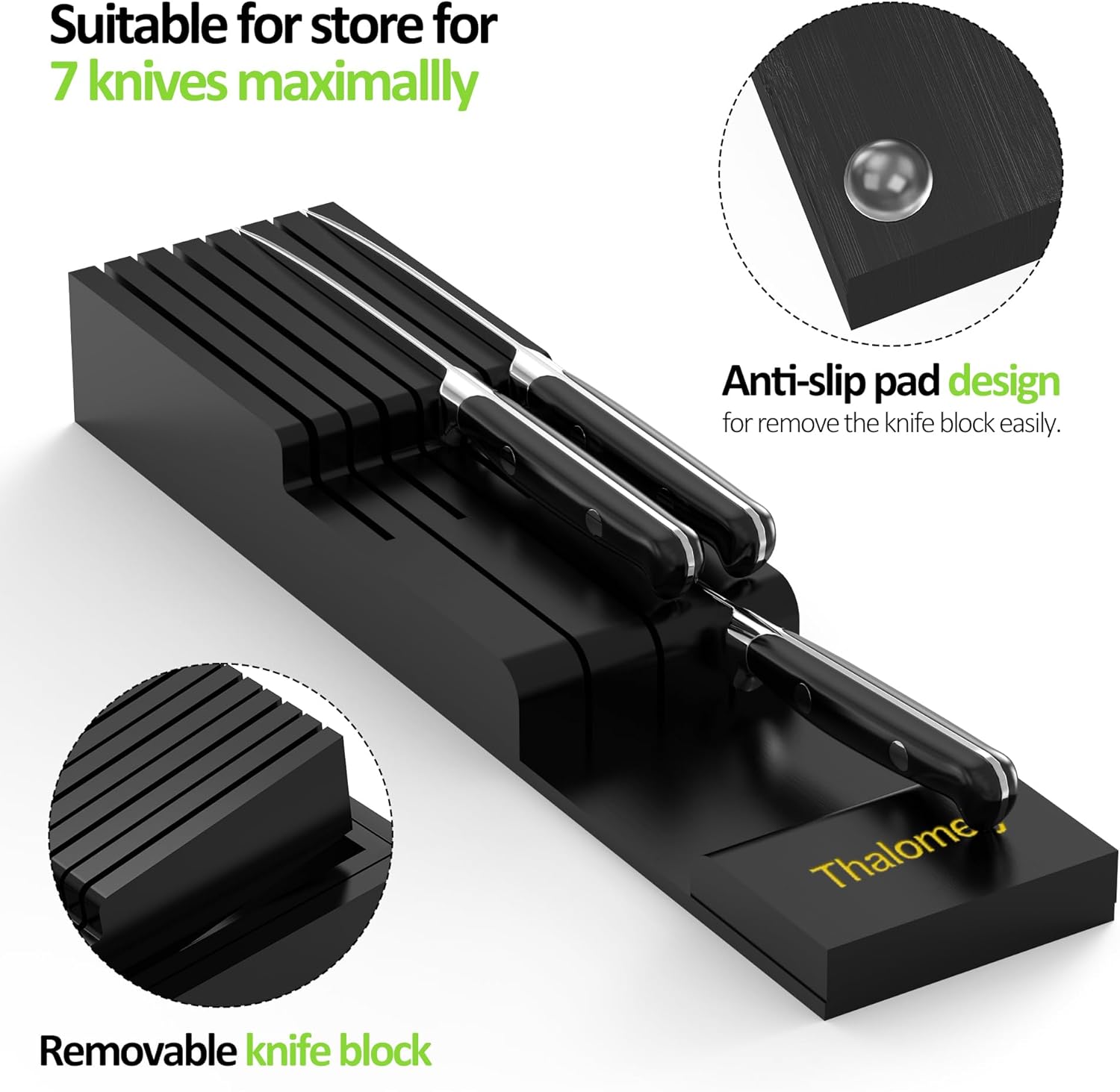 - Removable Knife Block Included: Includes a removable knife block (15.35" x 3.23" x 1.54") with four anti - slip silicone pads, holding 7 knives. It offers a safe, convenient storage solution and can be easily detached or reinstalled as needed.