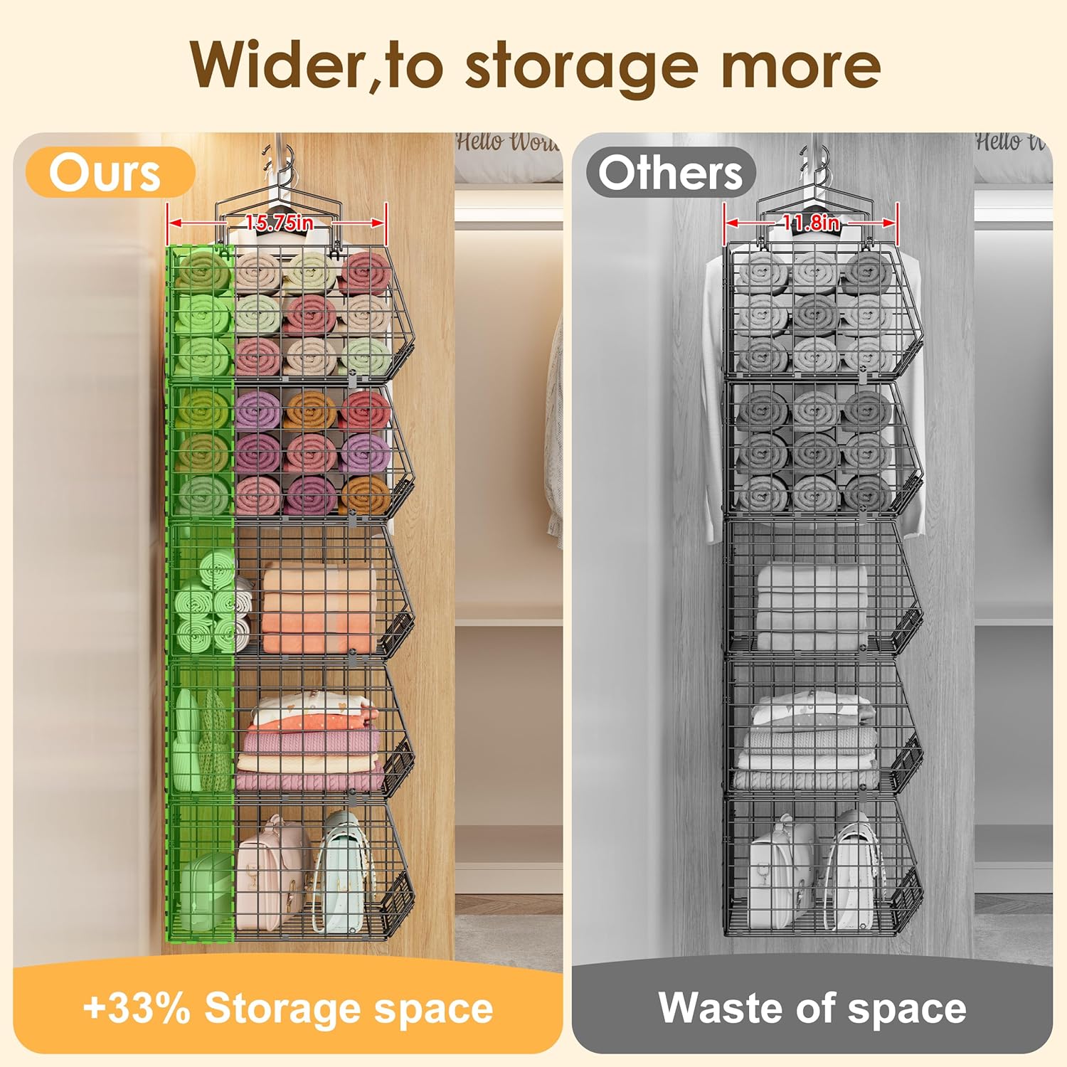 - 4'' Extra Space Design Hanging shelf & 5 Tier Wire closet hanging organizer: 👔This design is 4 inches deeper than ordinary wardrobe hanging baskets, fitting more snugly against the back wall of the cabinet. It can be adjusted to utilize unused space caused by the insufficient size of ordinary hanging storage, expanding dorm closet organizer space and making it more suitable for most people's wardrobes 👔The deepened storage closet fits more securely into the wardrobe, reducing shaking by 90%