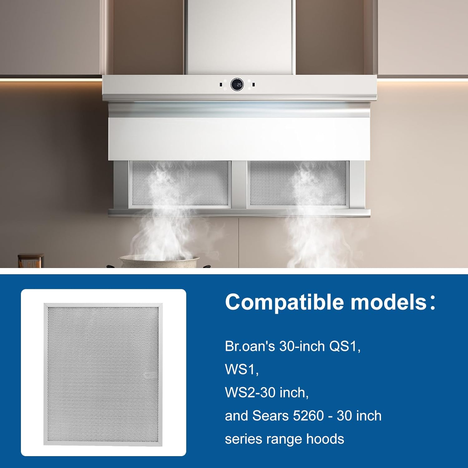 - COMPATIBILITY: This stove vent filter is 14.2" x 11.8", and it's a perfect replacement for Broan’s 30"QS1, WS1, WS2-30" series, plus Sears 5260 - 30"range hood filters. It’s a direct replaces BPS1FA30,99010299.S99010299,AP3378953,8322,S99010305 bpjdfa30,S99010302,BPS2FA30,99010305D etc.
