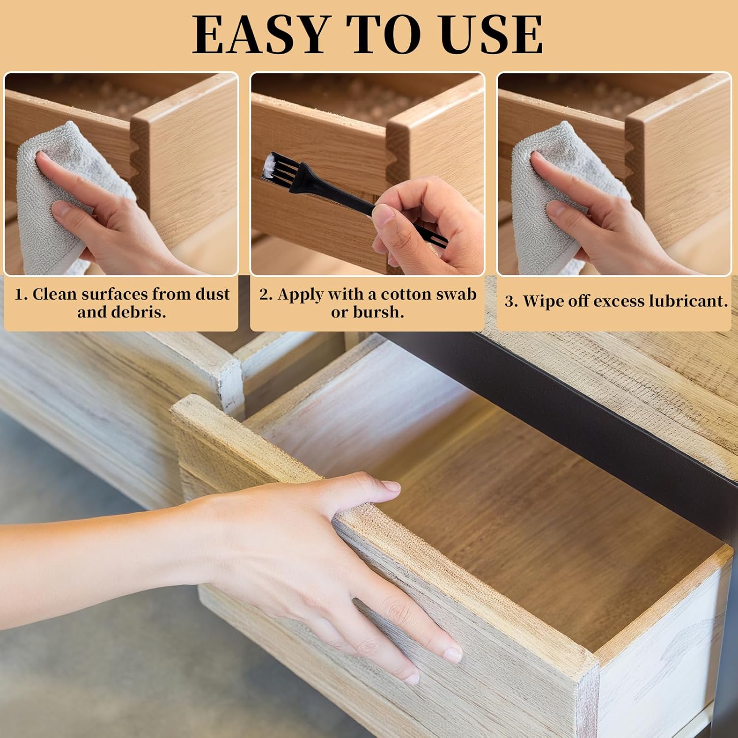 - Versatile Wood Lubricant: Ideal for household sliding tracks and turning or splicing: undermount drawer slides, door hinges, sliding doors/windows, sunroofs, seat tracks, and wooden moving parts—ensures smoother operation. Safe for multiple surfaces (metal, wood, glass, plastic, rubber) for home and workshop use.