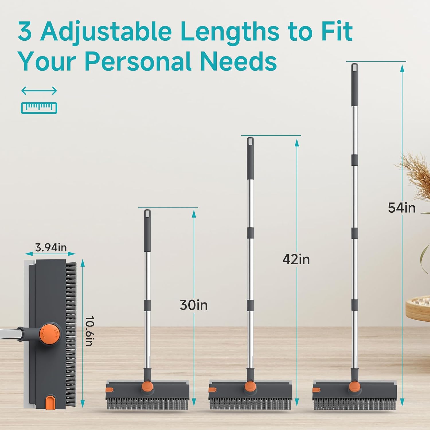 - 【3 Adjustable Lengths Scrubber Brush】Customize three height level adjustments at 30" - 42” - 54", you could choose the number of the part you assemble, for floor, shower glasses, walls cleaning at ease, say goodbye to unnecessary bending, and the stainless steel pole can last longer.