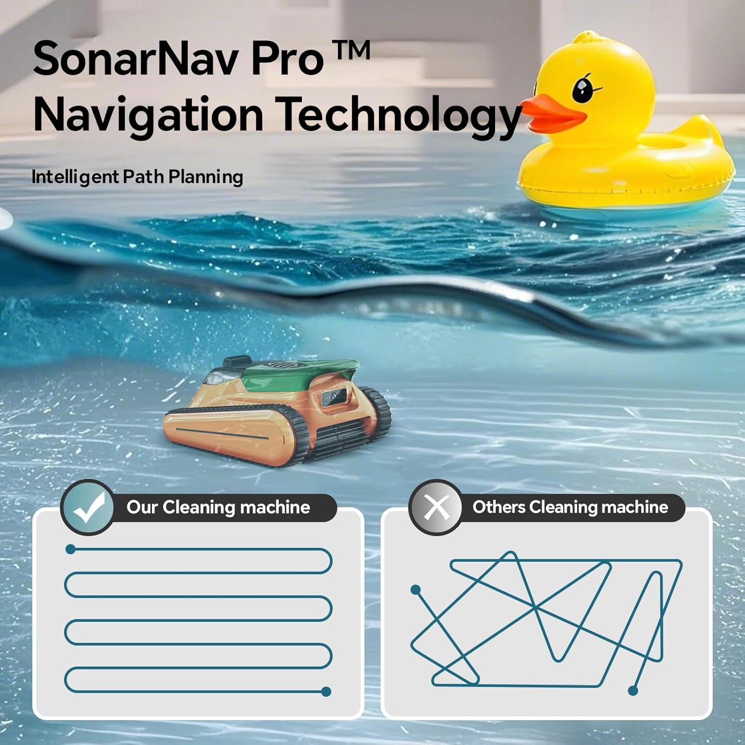 - Precision Navigation & Optimized Cleaning Path:Equipped with sonar-based route planning, this self-docking robotic pool cleaner intelligently scans and maps your pool for efficient coverage. By minimizing overlap and missed areas, it shortens cleaning time while ensuring thorough coverage across pools of all sizes and shapes.