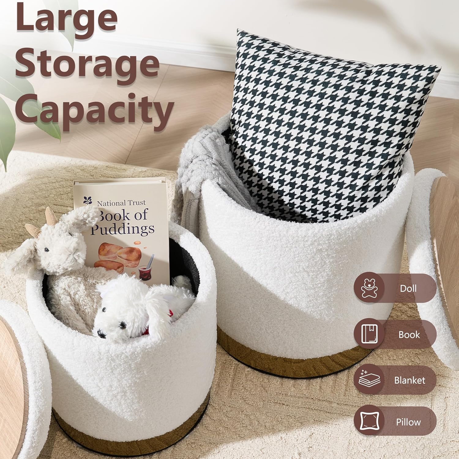 - 【Perfect Space-Saving Set of 2】This round storage ottoman set includes two thoughtfully sized pieces designed to stack neatly together. The larger ottoman measures 14.76" x 14.76" x 17.32", while the smaller one is 12.6" x 12.6" x 14.17". This smart design offers a convenient space-saving solution, perfect for keeping your living room, bedroom, or entryway organized and clutter-free.